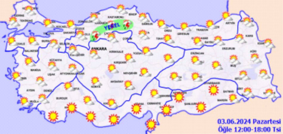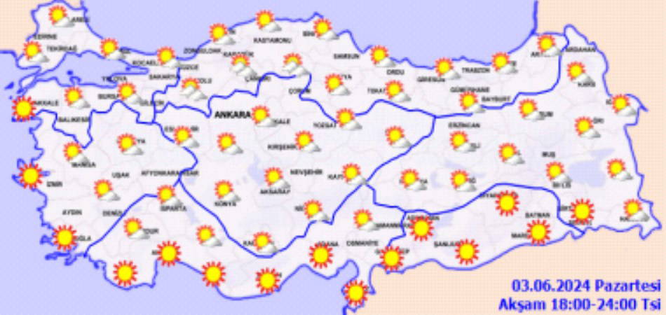 Meteoroloji Genel Müdürlüğü (MGM) tarafından yapılan son değerlendirmelere göre Trakya, Marmara'nın güneydoğusu, İç Ege, İç Anadolu'nun kuzeybatısı, Batı Karadeniz'in iç kesimleri ile Doğu Anadolu'nun doğusunun yer yer parçalı bulutlu, Karabük ve Kastamonu'nun güney kesimleri ile Çankırı'nın kuzey çevrelerinin kısa süreli ve yerel olmak üzere sağanak ve gök gürültülü sağanak yağışlı, diğer yerlerin az bulutlu ve açık geçeceği tahmin ediliyor.