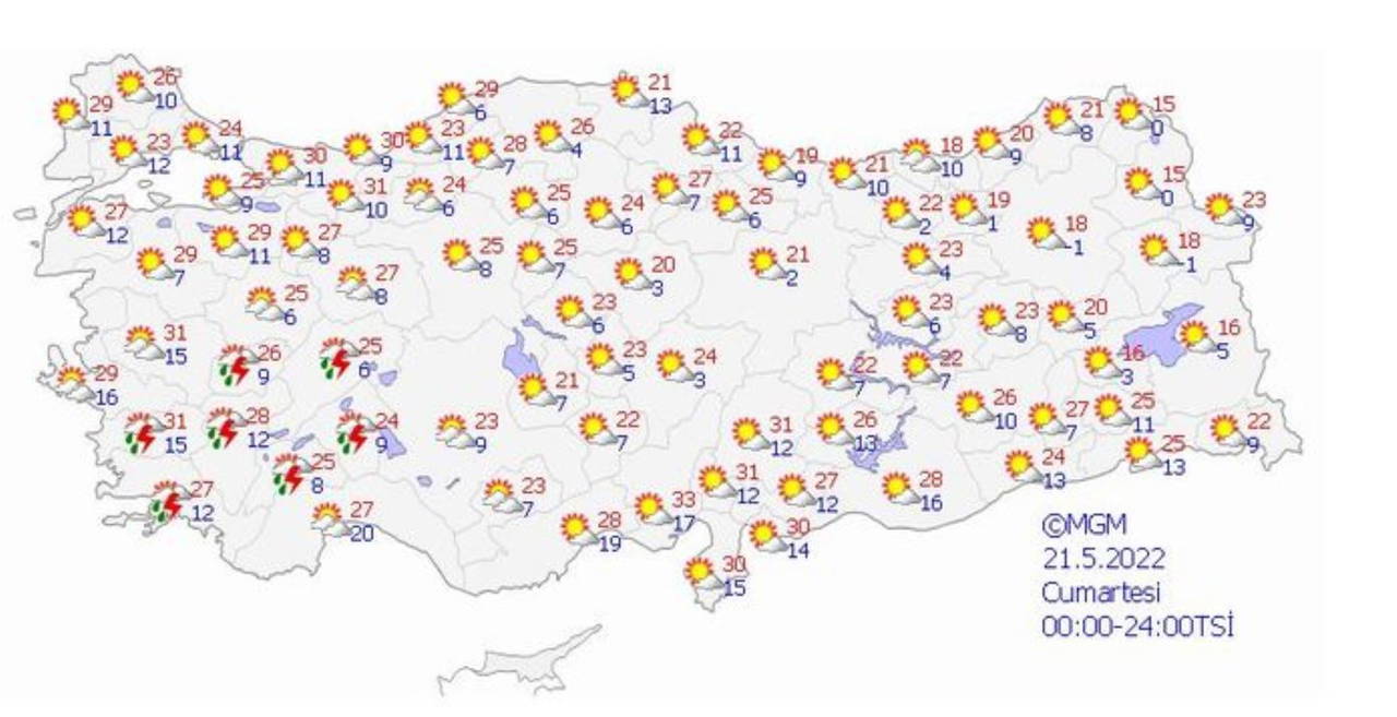 - İZMİR: 29, Parçalı ve çok bulutlu, güney ve doğu kesimleri yerel sağanak ve gök gürültülü sağanak yağışlı.