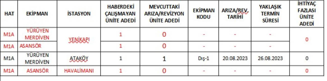 Gerçek: M1B hattında 70 adet yürüyen merdiven/bant ve 29 adet asansör bulunmaktadır. Bu ekipmanlardan 8 adet yürüyen merdiven ve 1 adet asansör ilgili bölümlerden yolcu alınmaması nedeniyle çalıştırılmamaktadır.  Güncel bilgiler aşağıdaki gibidir.