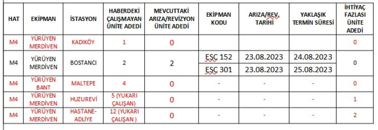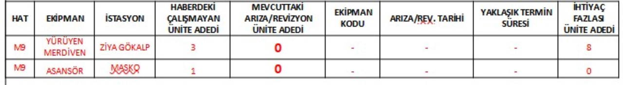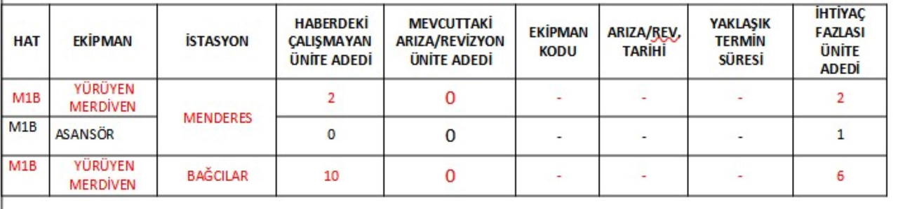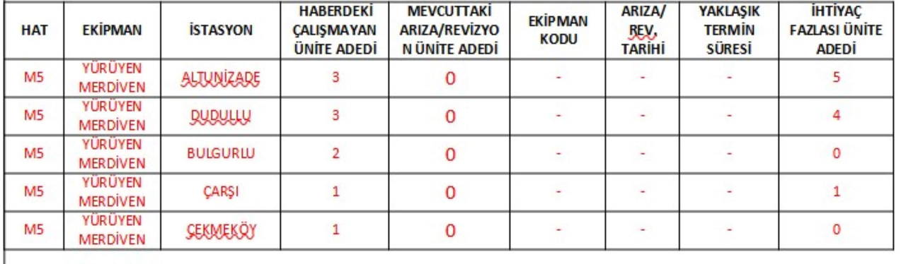 Gerçek: M3 Metro Hattında toplam 228 adet yürüyen merdiven ve 45 adet asansör bulunmaktadır. An itibariyle arızamız bulunmamaktadır. Güncel bilgiler aşağıdaki gibidir.