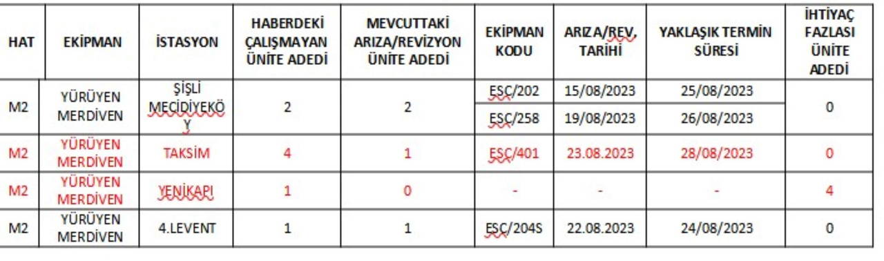 Hacıosman-Yenikapı M2 hattında 16 istasyon bulunuyor. Şişli-Mecidiyeköy durağında Şişli Cami yönüne çıkan yürüyen merdiven ile aynı durağın Fulya çıkışındaki merdiven çalışmıyor. Taksim istasyonunda ise Meydan'a çıkış ve iniş yönündeki yürüyen merdivenlerin hizmet vermemesi yolculukları daha da yorucu hale getiriyor. Merdiven önünde arızaya ilişkin paylaşılan bilgiye göre bu "çile"nin 30 Ağustos'a kadar devam edeceği anlaşılıyor.