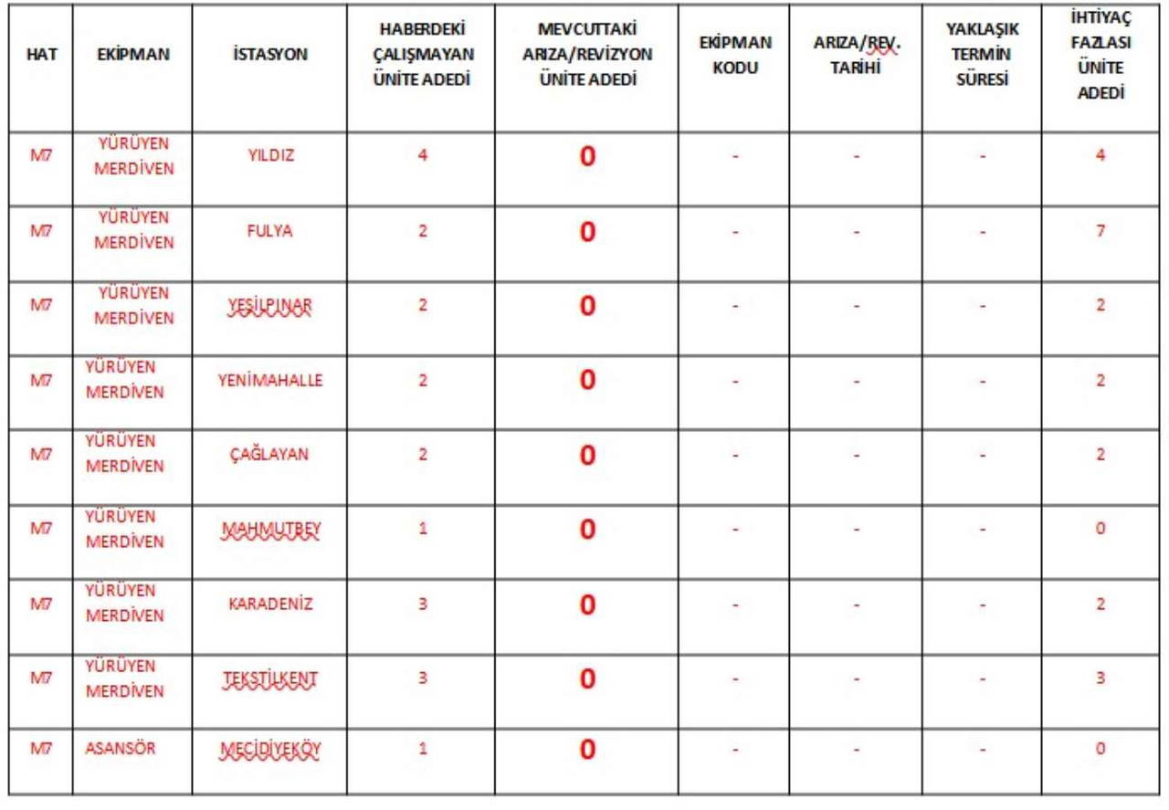Gerçek: M7 Yıldız Mahmutbey Metro Hattında toplam 260 adet yürüyen merdiven ve 121 adet asansör bulunmaktadır. Bu ekipmanlardan 22 adet yürüyen merdiven ilgili bölümlerden yolcu alınmaması nedeniyle çalıştırılmamaktadır. An itibariyle arızalı ekipman bulunmamaktadır.