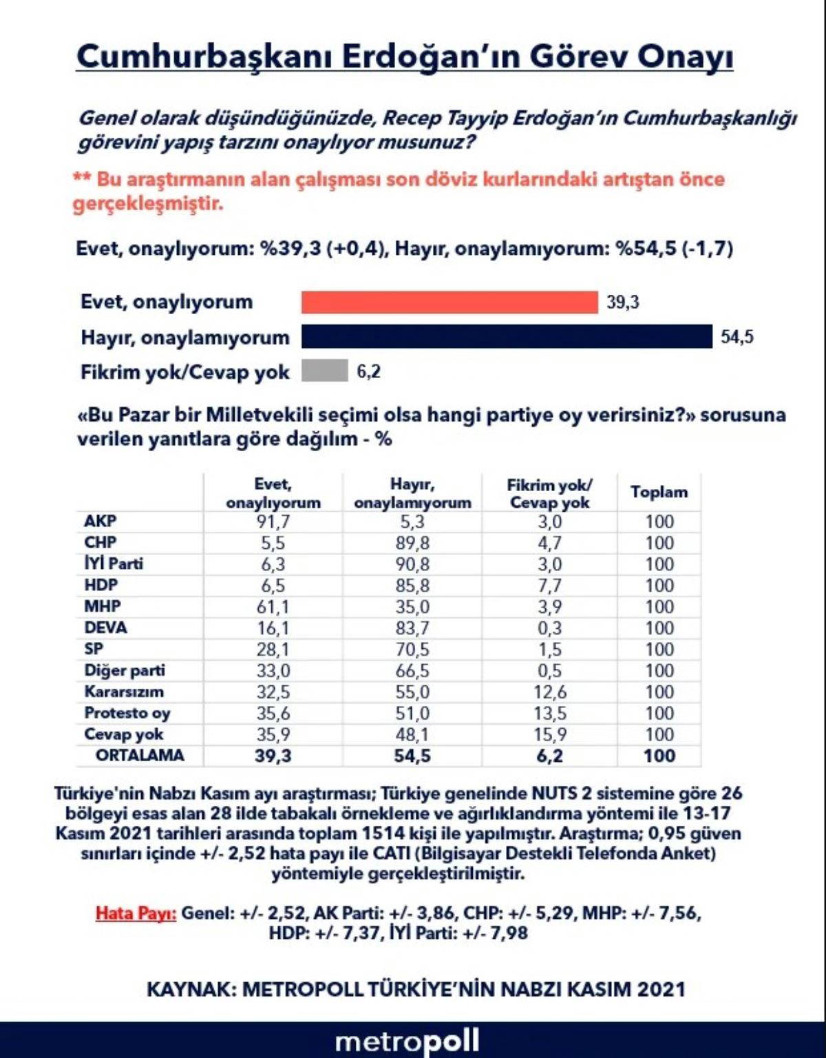 Metropol Araştırma "Türkiye'nin Nabzı Kasım 2021" çalışmasının Cumhurbaşkanı Erdoğan'ın görev onayıyla ilgili bölümünü yayınladı. Dövizdeki rekor artıştan önce yapılan araştırmada AKP'li Cumhurbaşkanı Recep Tayyip Erdoğan'ın görev yapış tarzını onaylayanların oranı yüzde 39.3, onaylamayanların oranı yüzde 54.5 olarak hesaplandı. Yüzde 6.2 ise 'Fikrim yok/Cevap yok' seçeneğini işaretledi.