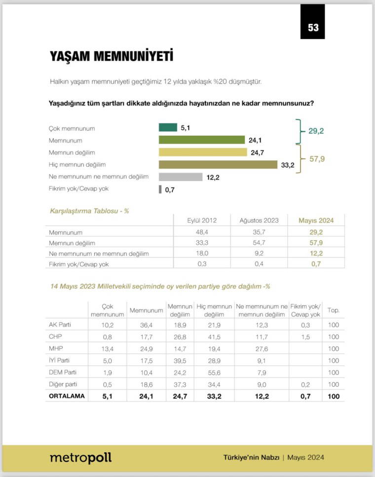 Yurttaşın oy dağılımına göre mutluluk oranları da çıkarılan ankette 2012 yılında verilen yüzde 48,4 'Memnunum' sonucunun 2024 yılında yüzde 29,2'ye düşmesi dikkat çekti.