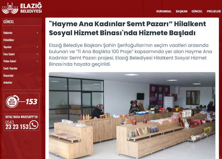 AKP’li Elazığ Belediye Başkanı ve AKP’nin Elazığ Belediye Başkan Adayı Şahin Şerifoğulları’nın 2019 seçimlerindeki projeleri arasında yer alan Hayme Ana Kadın Girişim Kooperatifi geçtiğimiz yıllarda hizmete başlamıştı.
