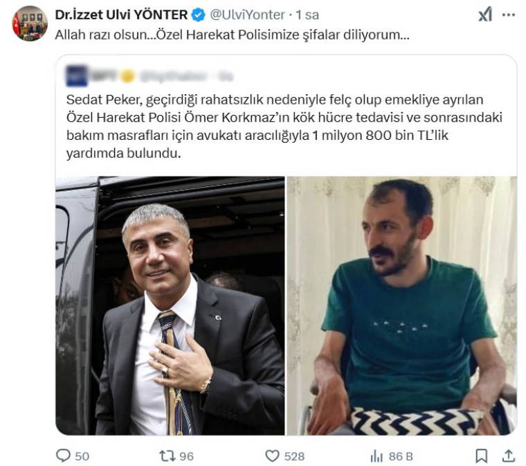 Peker'in alıntıladığı paylaşımlarda, "Sedat Peker, geçirdiği rahatsızlık nedeniyle felç olup emekliye ayrılan Özel Hareket Polisi Ömer Korkmaz'ın kök hücre tedavisi ve sonrasındaki bakım masrafları için avukatı aracılığıyla 1 milyon 800 bin liralık yardımda bulundu" ifadeleri yer aldı.