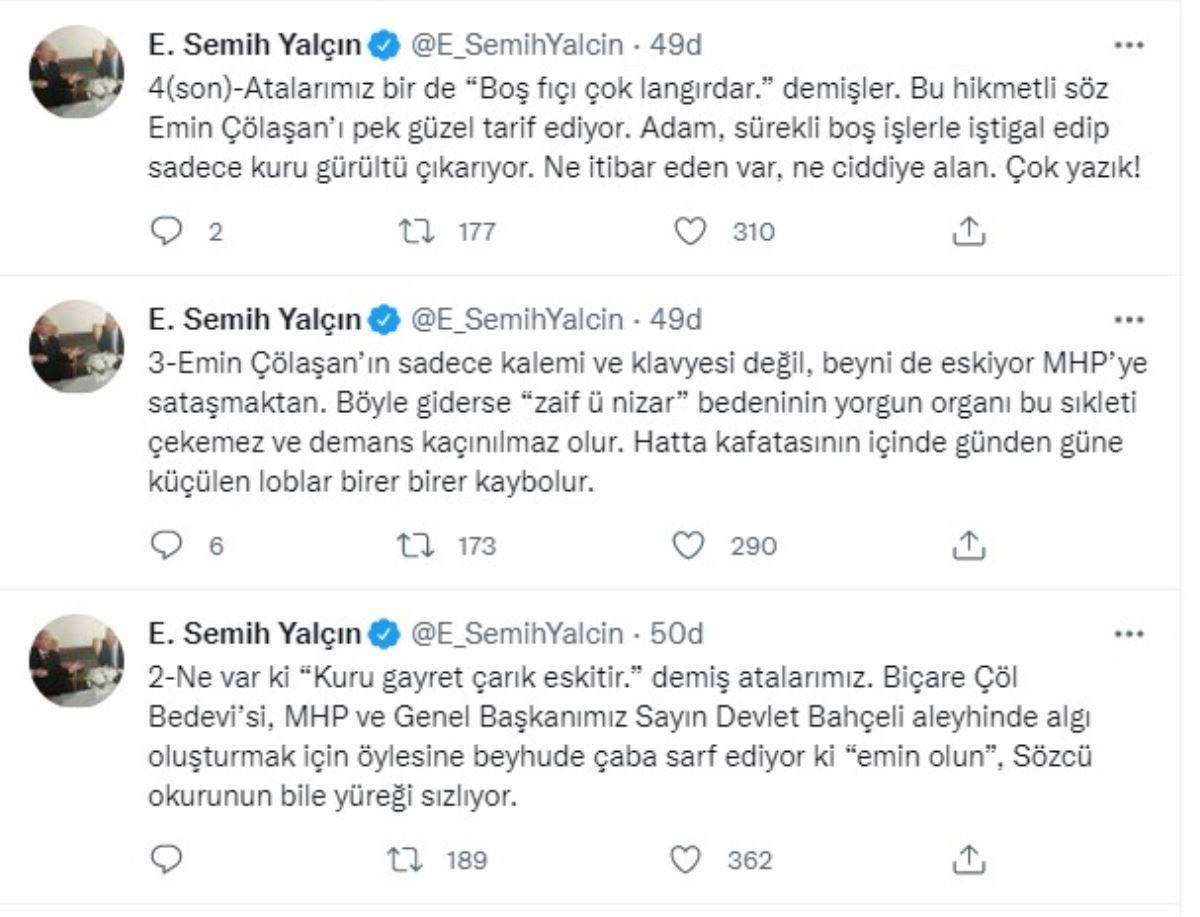 Çölaşan'ın bu yöndeki ifadelerine yanıt veren MHP Genel Başkan Yardımcısı Semih Yalçın, hakaret ifadeleri kullandı.