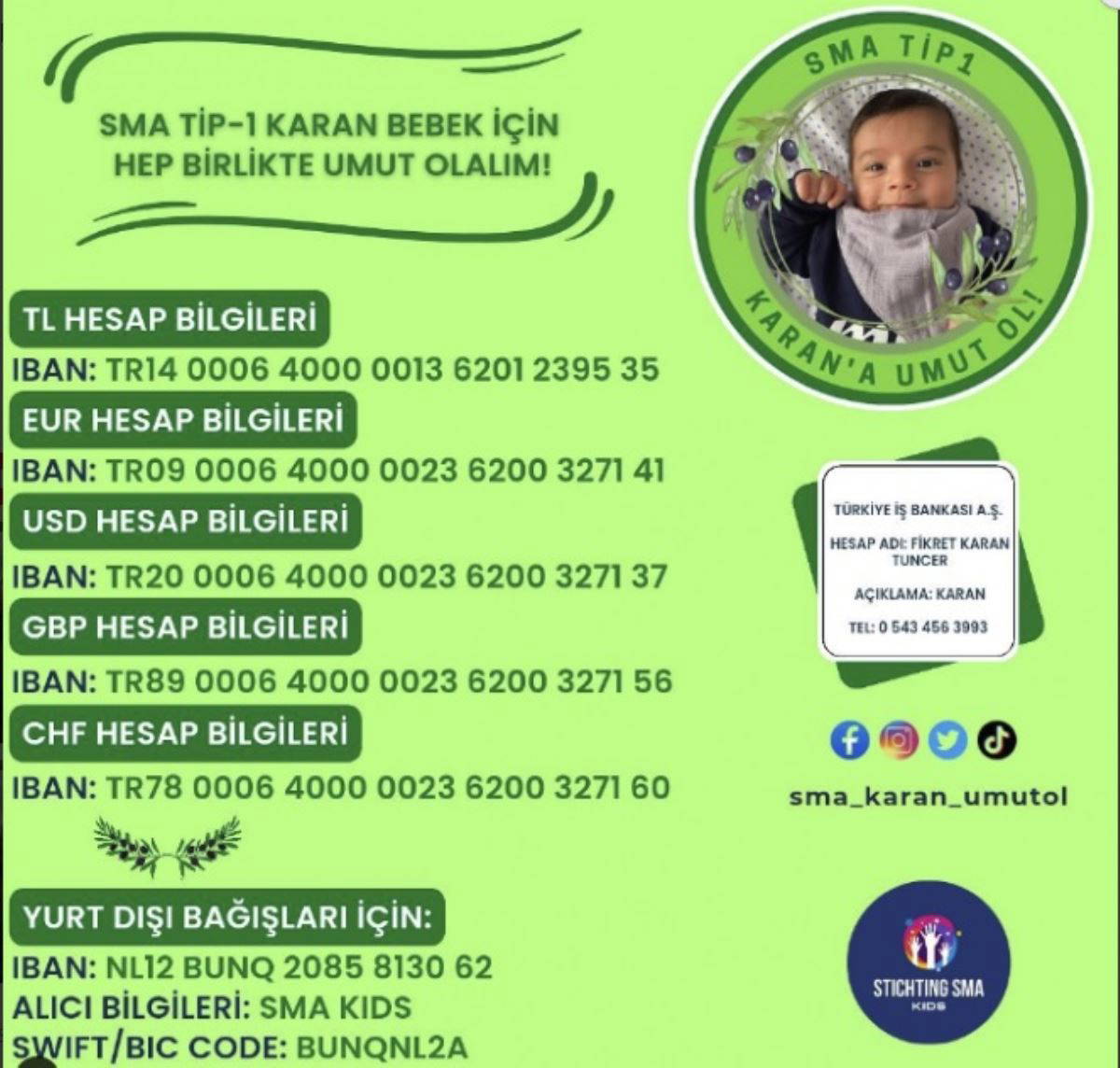 Muğla Milas’ta yaşayan Tuncer ailesinin oğulları Karan’a 24 günlükken SMA TİP 1 teşhisi konuldu. Milas’ın en küçük ve ilk tanı konmuş bebeği Karan’ın iyileşmesi için tek şansı yurtdışında uygulanan gen tedavisi. İlaç pahalı, zamanı kısıtlı. Karan, ilk 6 içinde tedavi görürse etki düzeyi üst düzey olacak. Ailesi tedavi için bağış kampanyası başlattı.