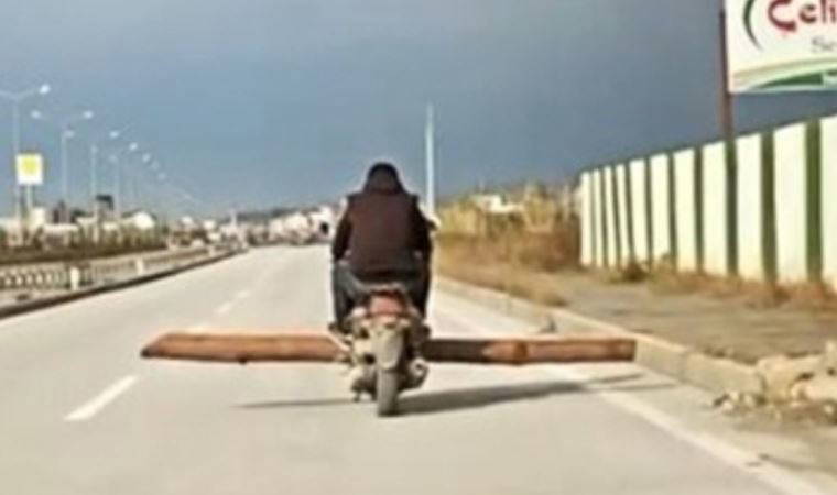 Bu kadarı da olmaz dedirten görüntüler, Manavgat’ın Ilıca Mahallesi D-400 yan yolunda araç kamerasına yansıdı. Plakası olmayan motosiklete yan olarak konulan yaklaşık 5 metrelik tomrukla şehirler arası yola çıkan sürücü, hem kendi canını hem diğer araç sürücülerinin hayatını tehlikeye attı.