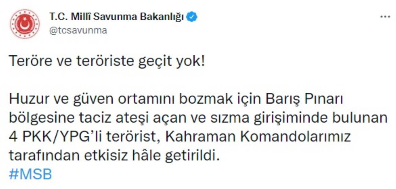MSB sosyal medya hesabından yapılan açıklama şöyle: "Teröre ve teröriste geçit yok! Huzur ve güven ortamını bozmak için Barış Pınarı bölgesine taciz ateşi açan ve sızma girişiminde bulunan 4 PKK/YPG’li terörist, Kahraman Komandolarımız tarafından etkisiz hâle getirildi."