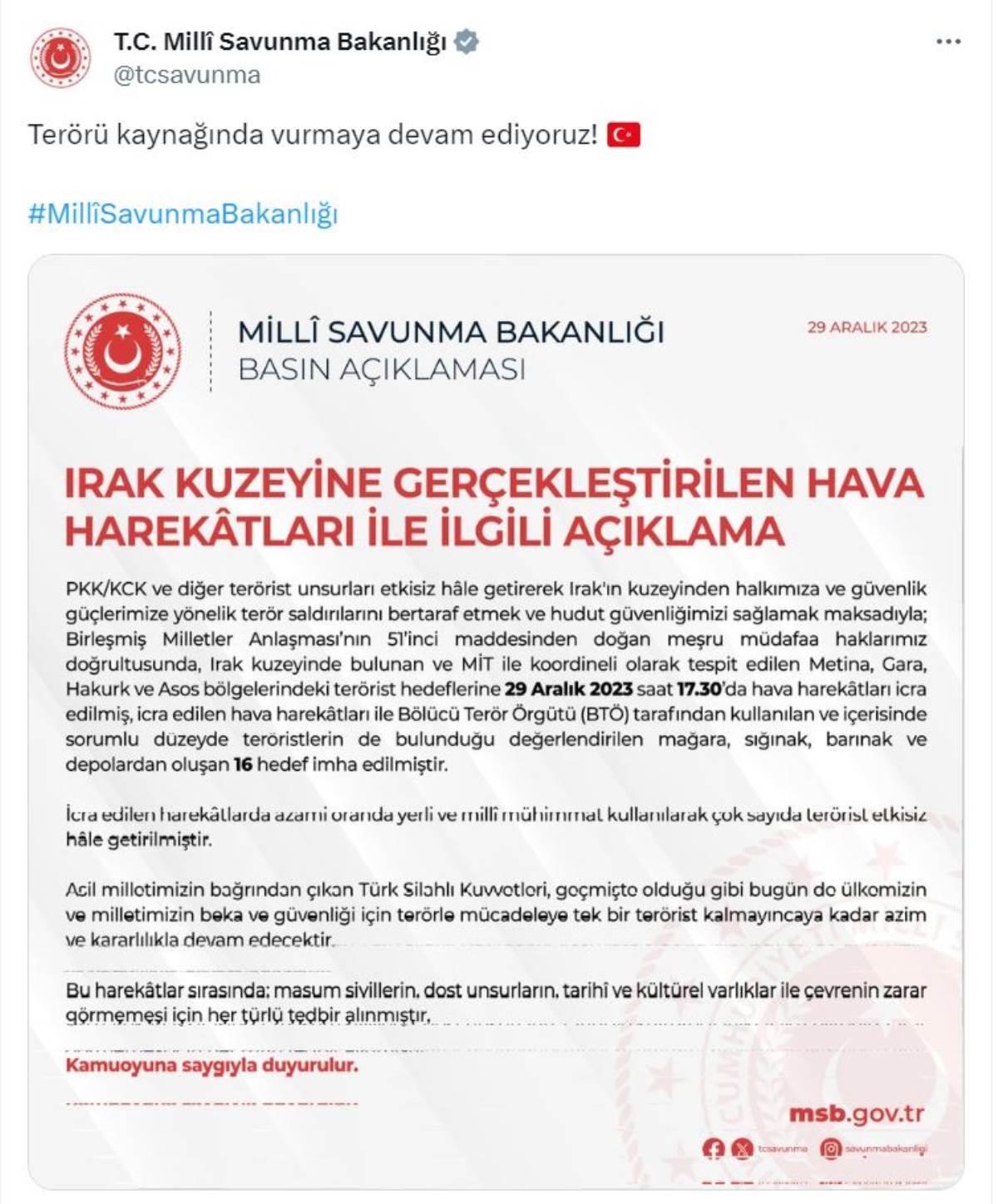 Milli Savunma Bakanlığı'nın (MSB) sosyal medya hesabından yapılan açıklamada, "PKK/KCK ve diğer terörist unsurları etkisiz hale getirerek Irak'ın kuzeyinden halkımıza ve güvenlik güçlerimize yönelik terör saldırılarını bertaraf etmek ve hudut güvenliğimizi sağlamak maksadıyla; Birleşmiş Milletler Anlaşması'nın 51'inci maddesinden doğan meşru müdafaa haklarımız doğrultusunda, Irak kuzeyinde bulunan ve MİT ile koordineli olarak tespit edilen Metina, Gara, Hakurk ve Asos bölgelerindeki terörist hedeflerine 29 Aralık 2023 saat 17.30’da hava harekatları icra edilmiş, icra edilen hava harekatları ile Bölücü Terör Örgütü (BTÖ) tarafından kullanılan ve içerisinde sorumlu düzeyde teröristlerin de bulunduğu değerlendirilen mağara, sığınak, barınak ve depolardan oluşan 16 hedef imha edilmiştir" denildi.