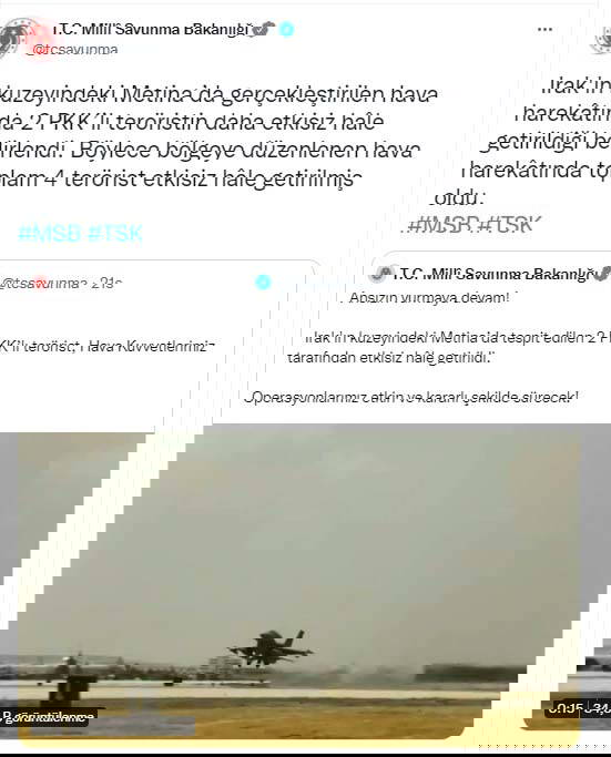 Bakanlığın Twitter'daki hesabından yapılan açıklamada, "Irak'ın kuzeyindeki Metina'da gerçekleştirilen hava harekâtında 2 PKK'li teröristin daha etkisiz hâle getirildiği belirlendi. Böylece bölgeye düzenlenen hava harekâtında toplam 4 terörist etkisiz hale getirilmiş oldu" denildi.