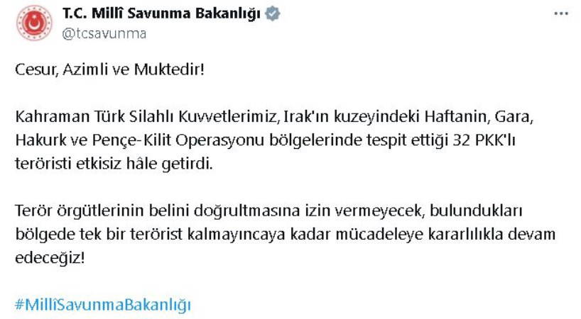 Bakanlığın sosyal medya hesabından yapılan açıklamada, "Cesur, azimli ve muktedir. Kahraman Türk Silahlı Kuvvetlerimiz, Irak'ın kuzeyindeki Haftanin, Gara, Hakurk ve Pençe-Kilit Operasyonu bölgelerinde tespit ettiği 32 PKK'lı teröristi etkisiz hale getirdi. Terör örgütlerinin belini doğrultmasına izin vermeyecek, bulundukları bölgede tek bir terörist kalmayıncaya kadar mücadeleye kararlılıkla devam edeceğiz" denildi.