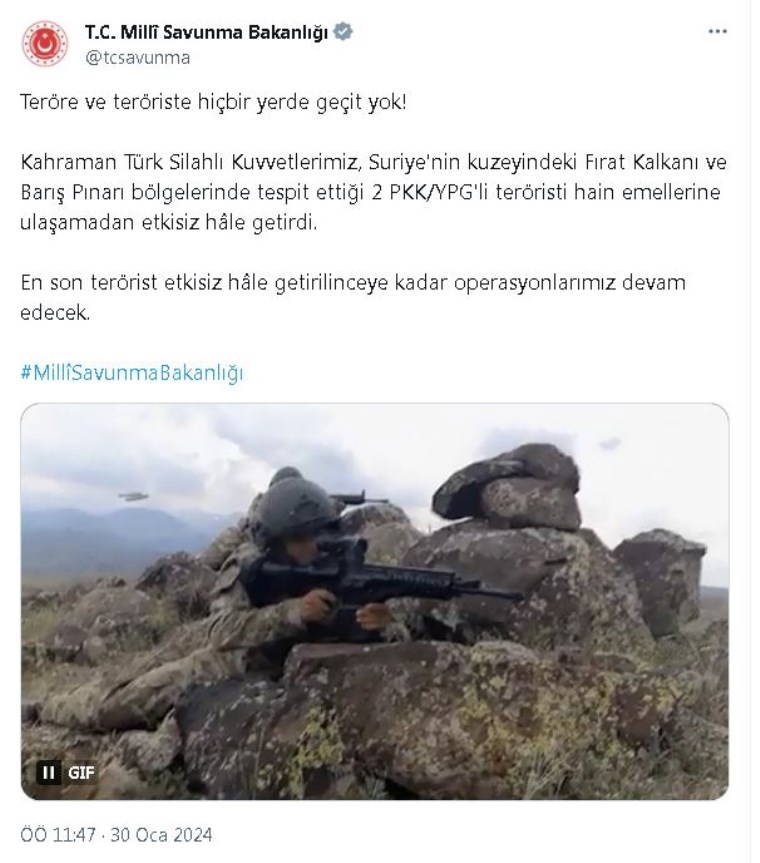 Bakanlığın sosyal medya hesabından yapılan açıklamada, "Teröre ve teröriste hiçbir yerde geçit yok. Kahraman Türk Silahlı Kuvvetlerimiz, Suriye'nin kuzeyindeki Fırat Kalkanı ve Barış Pınarı bölgelerinde tespit ettiği 2 PKK/YPG'li teröristi hain emellerine ulaşamadan etkisiz hale getirdi. En son terörist etkisiz hale getirilinceye kadar operasyonlarımız devam edecek" denildi.
