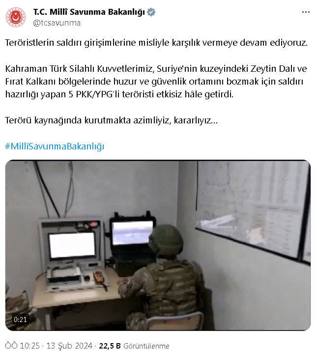 Bakanlığın sosyal medya hesabından yapılan açıklamada, "Teröristlerin saldırı girişimlerine misliyle karşılık vermeye devam ediyoruz. Kahraman Türk Silahlı Kuvvetlerimiz, Suriye'nin kuzeyindeki Zeytin Dalı ve Fırat Kalkanı bölgelerinde huzur ve güvenlik ortamını bozmak için saldırı hazırlığı yapan 5 PKK/YPG'li teröristi etkisiz hale getirdi. Terörü kaynağında kurutmakta azimliyiz, kararlıyız" denildi.