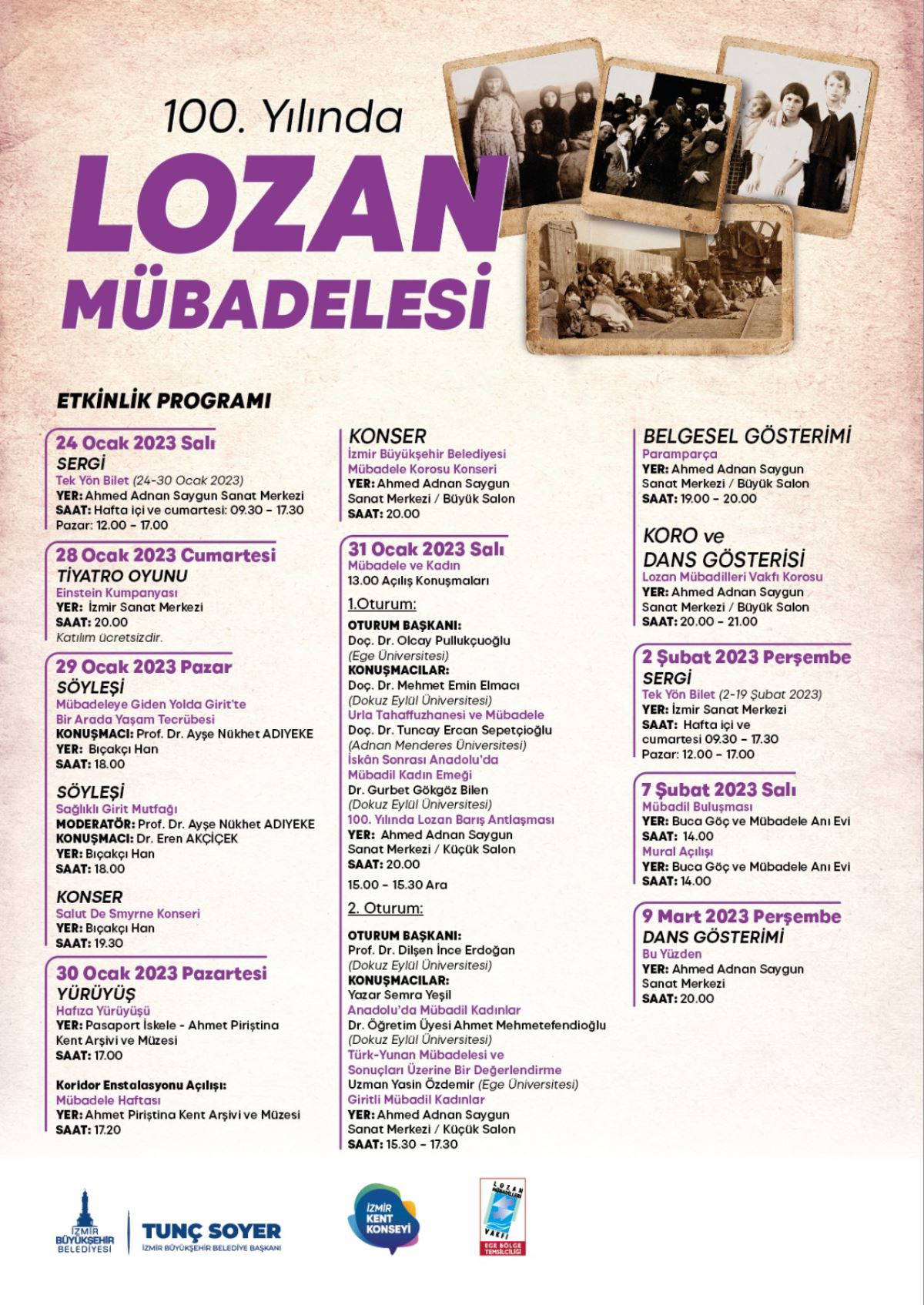 İzmir Büyükşehir Belediyesi, Türkiye ile Yunanistan arasında yapılan mübadele anlaşmasının 100’üncü yıldönümünde bir dizi etkinliğe ev sahipliği yapıyor. Mart ayına kadar tiyatro oyunundan söyleşiye, fotoğraf sergisinden konsere pek çok etkinlik İzmirlilerle buluşacak.