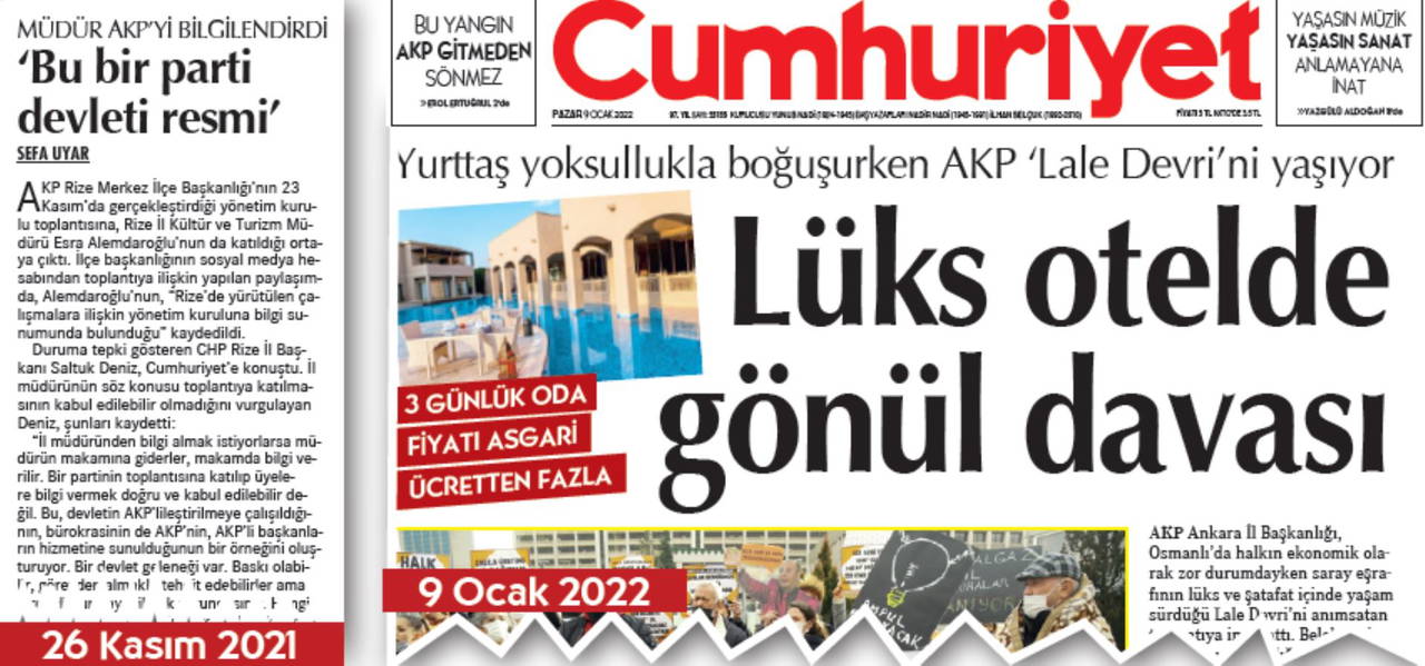 AKP Ankara İl Başkanlığı, bu ayki 3 günlük istişare toplantısını, Antalya’daki ultra lüks bir otelde düzenlemişti. “Bir gönül davası” sloganı ile düzenlenen toplantıya, Ulaştırma ve Altyapı Bakanı Adil Karaismailoğlu, Çevre, Şehircilik ve İklim Değişikliği Bakanı Murat Kurum ve Dışişleri Bakanı Mevlüt Çavuşoğlu da katılmış, AKP teşkilatına bakanlığın çalışmaları ve projeler hakkında sunumlar yapmışlardı. AKP Rize Merkez İlçe Başkanlığı’nın 23 Kasım’da gerçekleştirdiği yönetim kurulu toplantısına ise Rize İl Kültür ve Turizm Müdürü Esra Alemdaroğlu da katılmış ve yönetim kuruluna “bilgi sunumu” yapmıştı.