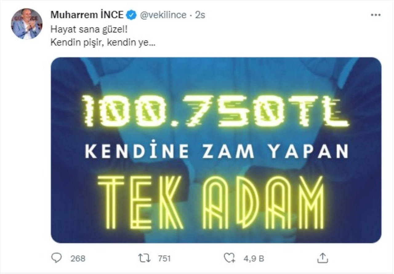 “100 bin 750 TL…Kendine zam yapan tek adam” ifadesinin yer aldığı görseli paylaşan İnce, “Hayat sana güzel! Kendin pişir, kendin ye…” notunu düştü.