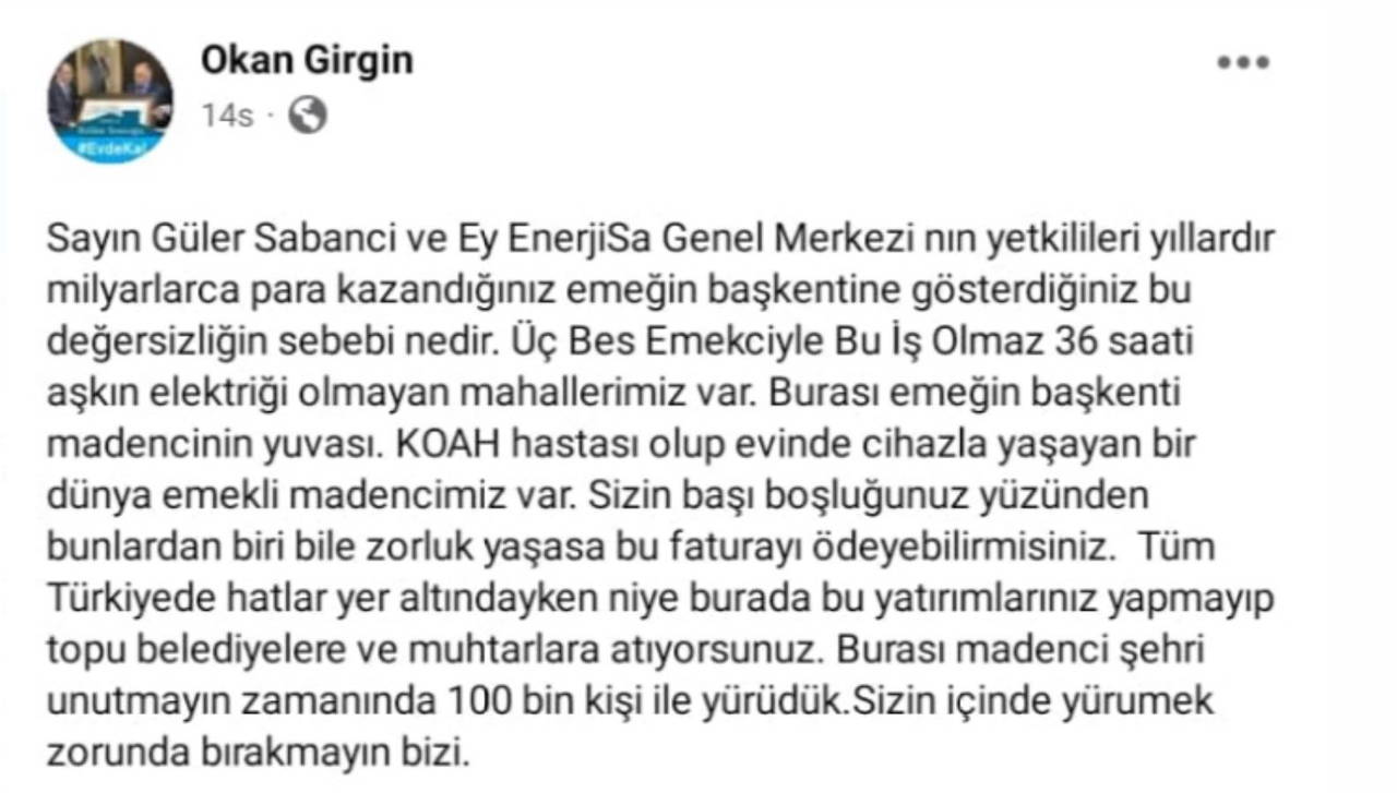 "Sayın Güler Sabancı ve Ey EnerjiSa Genel Merkezi'nin yetkilileri yıllardır milyarlarca para kazandığınız emeğin başkentine gösterdiğiniz bu değersizliğin sebebi nedir? Üç-beş emekçiyle bu iş olmaz. 36 saati aşkın elektriği olmayan mahallelerimiz var. Burası emeğin başkenti, madencinin yuvası. KOAH hastası olup evinde cihazla yaşayan bir dünya emekli madencimiz var. Sizin başı boşluğunuz yüzünden bunlardan biri bile zorluk yaşasa bu faturayı ödeyebilir misiniz. Tüm Türkiye'de hatlar yer altındayken niye burada bu yatırımlarınızı yapmayıp topu belediyelere ve muhtarlara atıyorsunuz. Burası madenci şehri unutmayın, zamanında 100 bin kişi ile yürüdük. Sizin için de yürümek zorunda bırakmayın bizi."