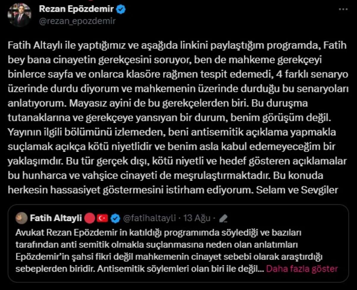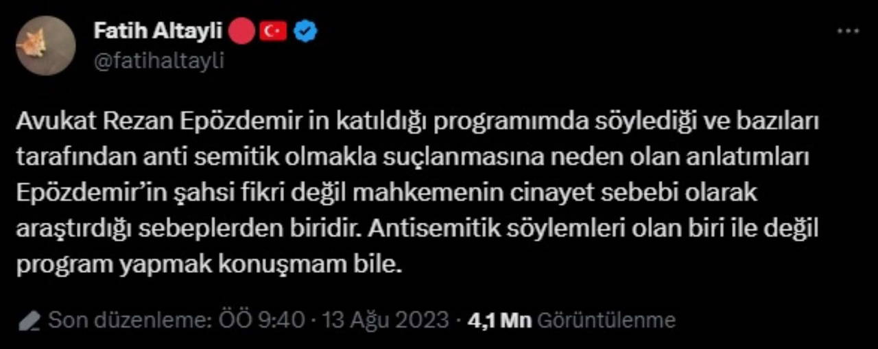 Altaylı, “Avukat Rezan Epözdemir in katıldığı programımda söylediği ve bazıları tarafından anti semitik olmakla suçlanmasına neden olan anlatımları Epözdemir’in şahsi fikri değil mahkemenin cinayet sebebi olarak araştırdığı sebeplerden biridir. Anti semitik söylemleri olan biri ile değil program yapmak konuşmam bile” ifadelerini kullandı.