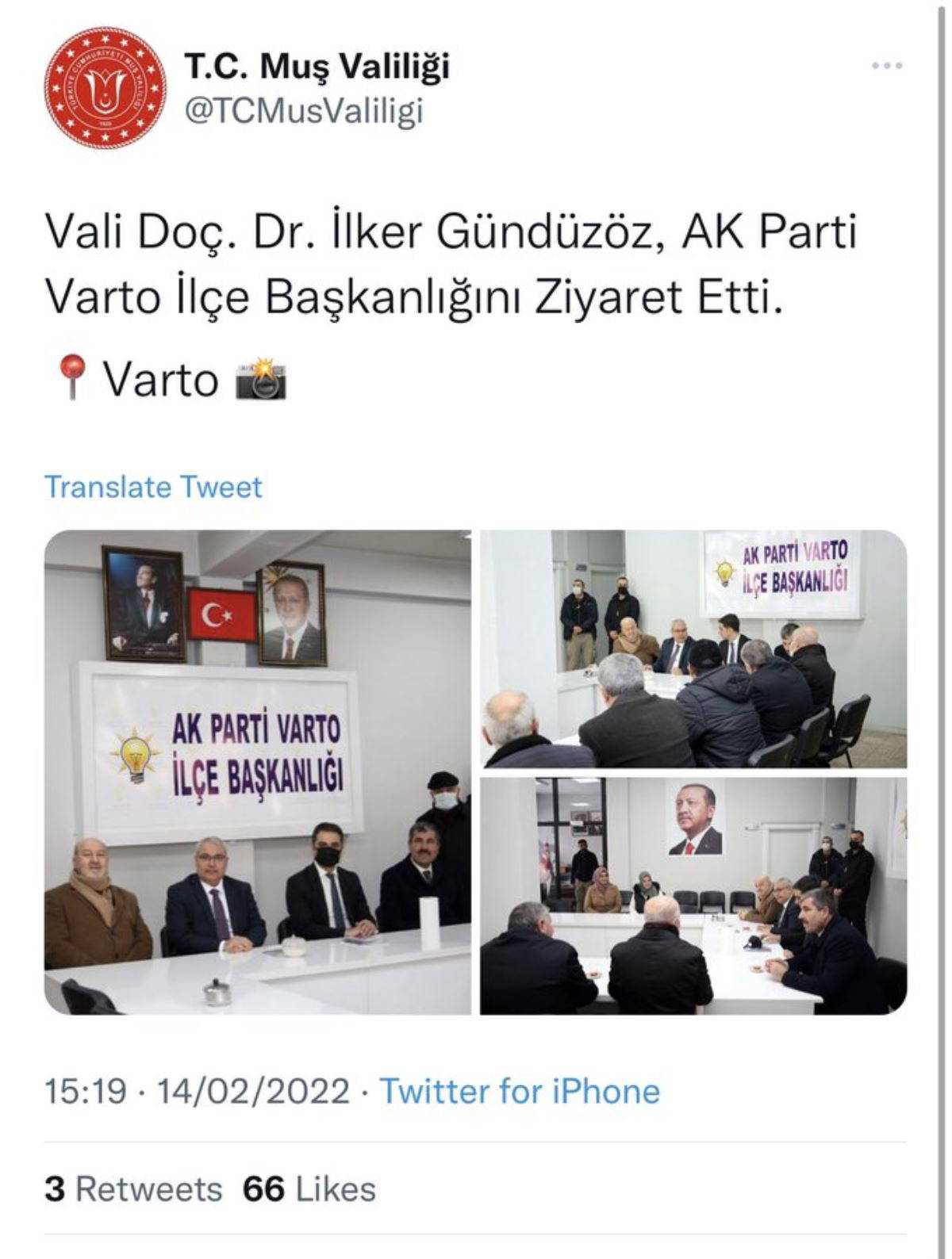 Söz konusu gönderide, Vali Doç. Dr. İlker Gündüzöz'ün AKP Varto İlçe Başkanlığını ziyaret ettiği belirtildi. Paylaşımda, Vali ve AKP'li üyelerin fotoğrafları da yer aldı.