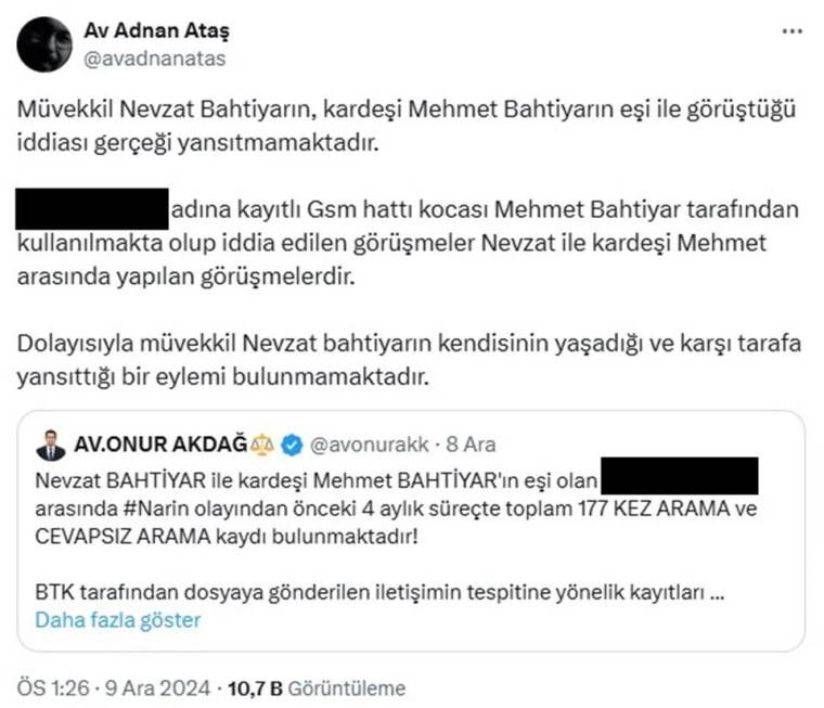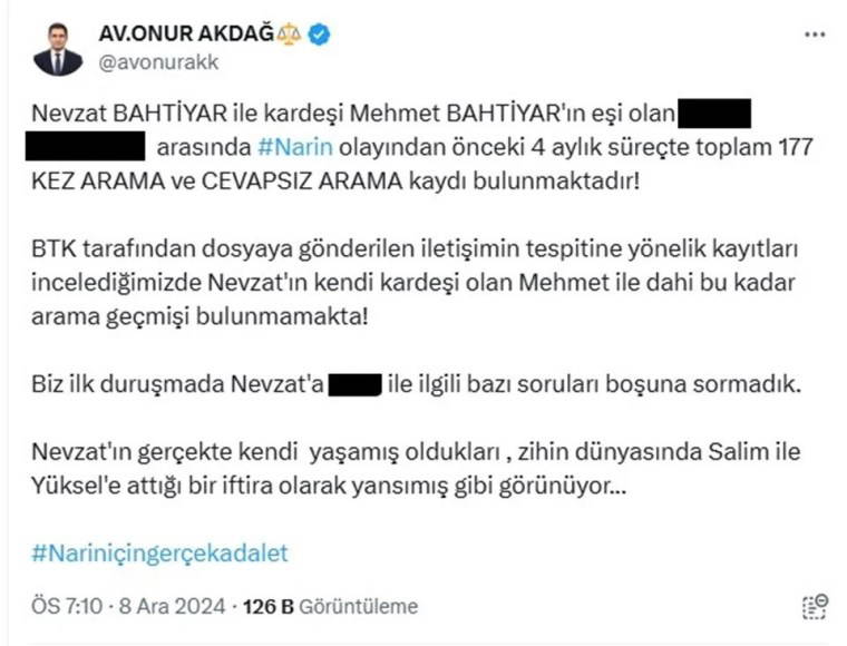 İtirafçı Nevzat Bahtiyar'ın, kardeşi Mehmet Bahtiyar'ın eşi A.B. ile yasak aşk yaşadığını iddia eden Avukat Onur Akdağ, "Nevzat Bahtiyar ile kardeşi Mehmet Bahtiyar'ın eşi olan A.B. arasında Narin olayından önceki 4 aylık süreçte toplam 177 kez arama ve cevapsız arama kaydı bulunmaktadır! BTK tarafından dosyaya gönderilen iletişimin tespitine yönelik kayıtları incelediğimizde Nevzat'ın kendi kardeşi olan Mehmet ile dahi bu kadar arama geçmişi bulunmamakta!" dedi.