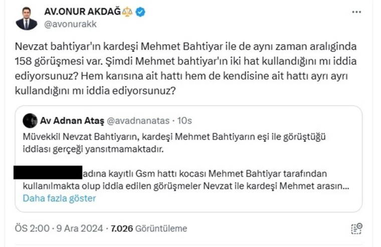 Akdağ, “Nevzat Bahtiyar’ın kardeşi Mehmet Bahtiyar ile de aynı zaman aralağında 158 görüşmesi var. Şimdi Mehmet Bahtiyar’ın iki hat kullandığını mı iddia ediyorsunuz? Hem karısına ait hattı hem de kendisine ait hattı ayrı ayrı kullandığını mı iddia ediyorsunuz?” sorusunu yöneltti.