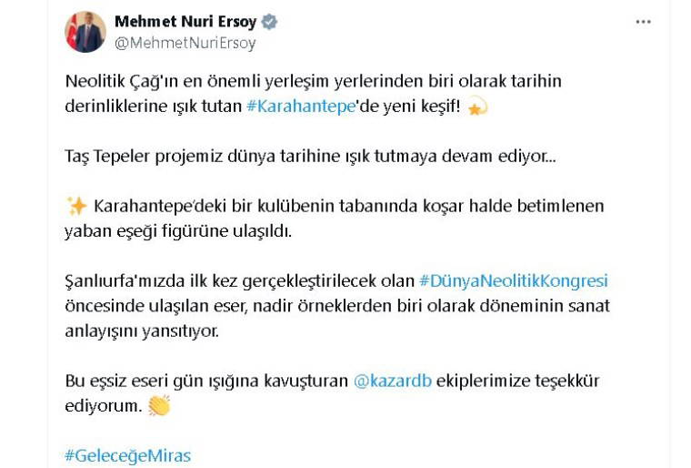Bakan Ersoy, sosyal medya hesabından yaptığı açıklamada, "Neolitik Çağ'ın en önemli yerleşim yerlerinden biri olarak tarihin derinliklerine ışık tutan Karahantepe'de yeni keşif. Taş Tepeler Projemiz dünya tarihine ışık tutmaya devam ediyor. Karahantepe'deki bir kulübenin tabanında koşar halde betimlenen yaban eşeği figürüne ulaşıldı. Şanlıurfamızda ilk kez gerçekleştirilecek olan Dünya Neolitik Kongresi öncesinde ulaşılan eser, nadir örneklerden biri olarak döneminin sanat anlayışını yansıtıyor. Bu eşsiz eseri gün ışığına kavuşturan Kazılar ve Araştırmalar Dairesi Başkanlığı ekiplerimize teşekkür ediyorum" ifadelerini kullandı.