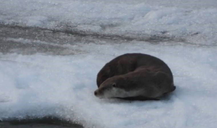 Erzurum’un İspir ilçesinde görülen su samuru, Çoruh Nehri'nin buz tutan kıyılarında dakikalarca eğlendikten sonra suya girerek kayboldu.