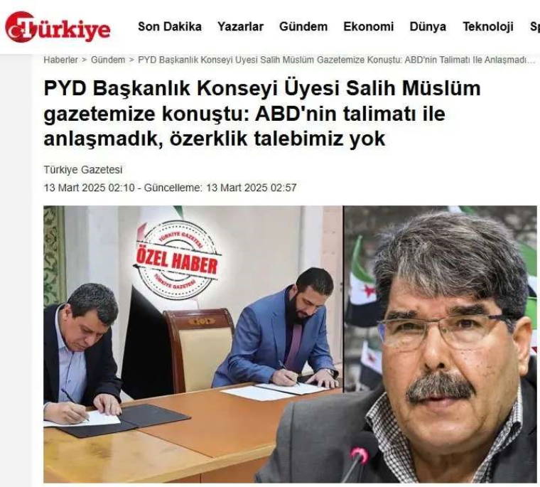 İktidara yakınlığıyla bilinen Türkiye Gazetesi, PYD yöneticisi Salih Müslim'le röportaj yaptı. Müslim, Suriye'deki yeni yönetimde HTŞ ile SDG'nin anlaşmasını içeren Şam mutabakatına dair açıklamalarda bulundu.