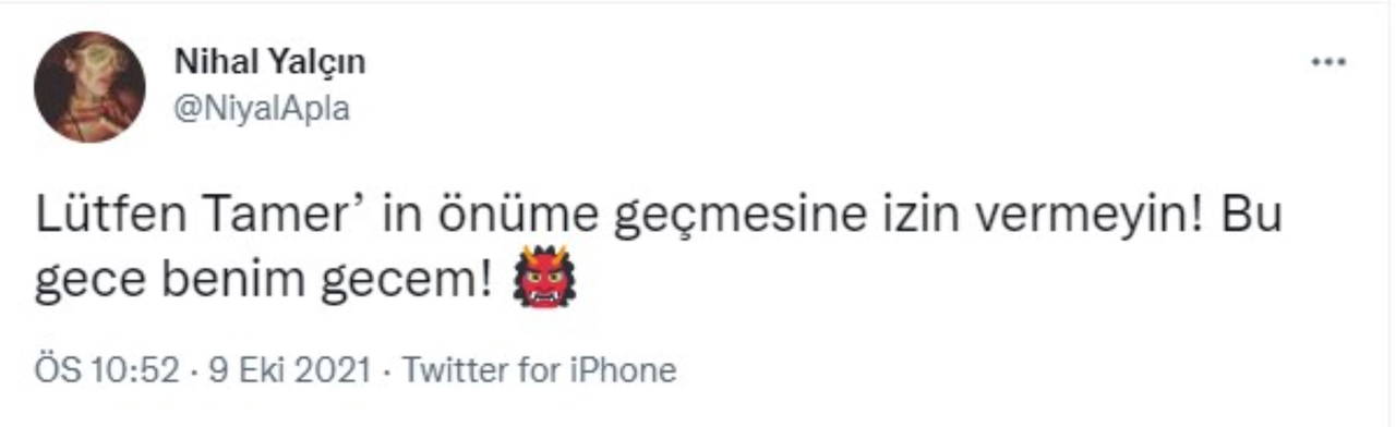 Karadağlı’nın hareketi sosyal medyada tepki aldı. Nihal Yalçın ise “Lütfen Tamer’ in önüme geçmesine izin vermeyin! Bu gece benim gecem!” diyerek Twitter üzerinden paylaşımda bulundu.
