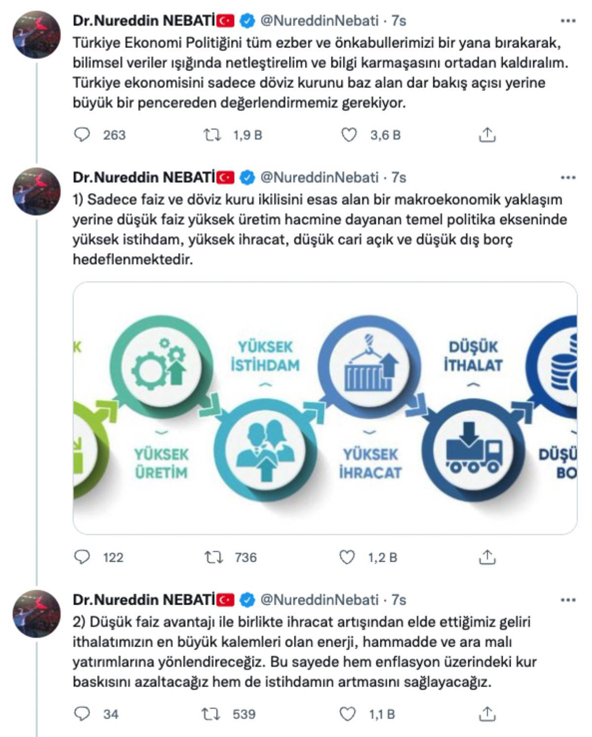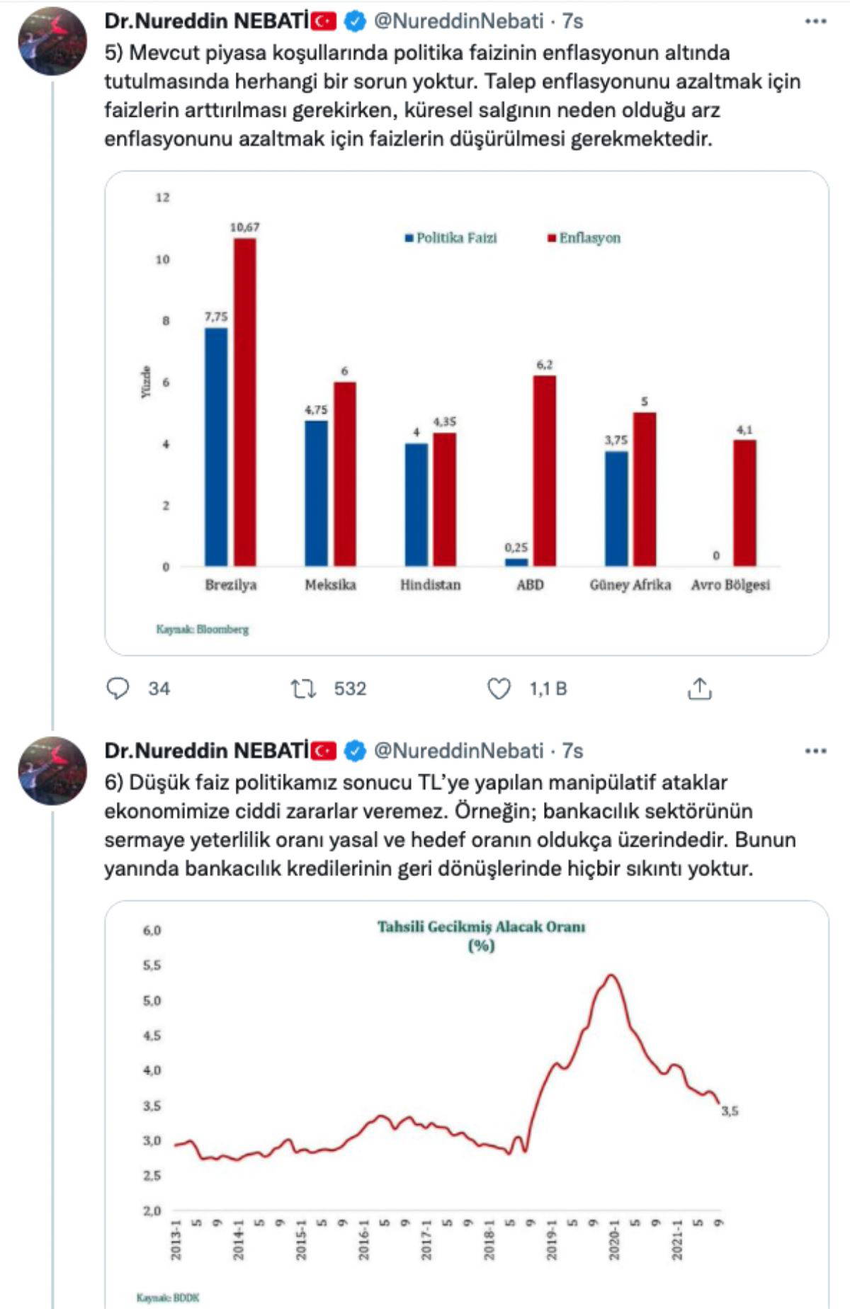 Faiz konusunda Cumhurbaşkanı Erdoğan'la aynı çizgide olan Bakan Yardımcısı Nebati tweetlerinde dikkat çeken ifadelere yer verdi. Faiz indirimin kararlı olduklarını vurgulayan Nebati, "Mevcut piyasa koşullarında politika faizinin enflasyonun altında tutulmasında herhangi bir sorun yoktur. Talep enflasyonunu azaltmak için faizlerin arttırılması gerekirken, küresel salgının neden olduğu arz enflasyonunu azaltmak için faizlerin düşürülmesi gerekmektedir" dedi.