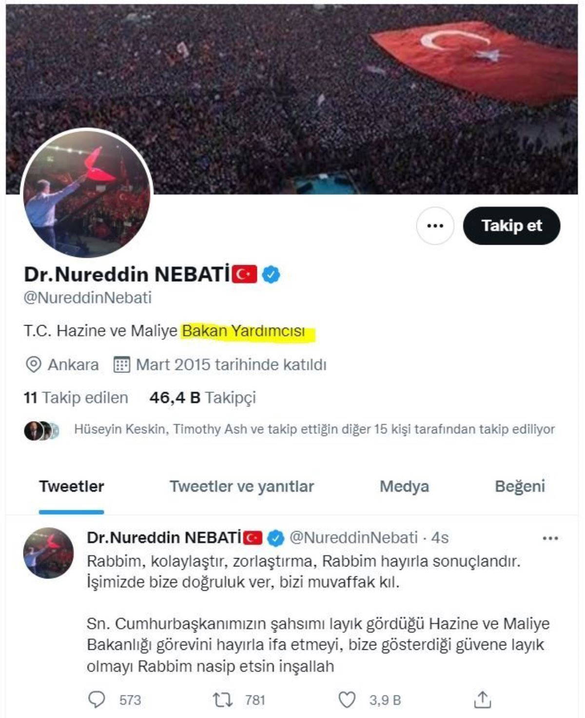 Bakan olarak ilk mesajını yayınlayan Nureddin Nebati’nin profilinde halen bakan yardımcısı yazması dikkat çekti.
