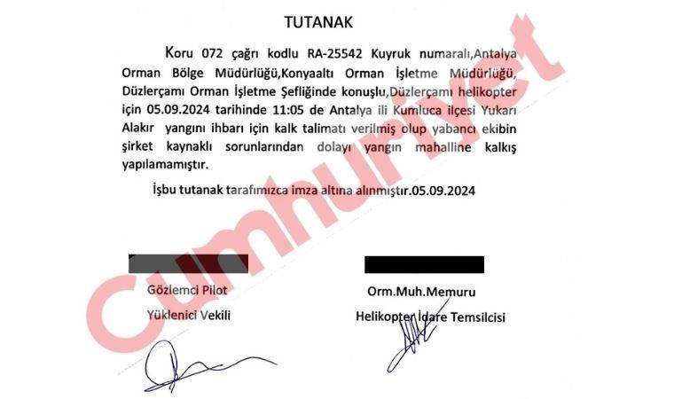 OGM’de görevli temsilci, mühendis, pilot ve şef imzalı tutanaklara göre; RA-25470 kuyruk numaralı helikopter pilotu ücretini alamadığı gerekçesiyle 30 Ağustos’ta Kütahya’nın Simav ilçesinde çıkan orman yangınına müdahale etmedi. RA – 25542 kuyruklu helikopterin pilotu da 30 Ağustos günü Antalya’nın Manavgat ilçesinde çıkan yangın için havalanmadı. Aynı helikopter pilotu 5 Eylül’de de Kumluca ilçesinde çıkan yangına müdahale etmedi. Adana’nın Aladağ mevkiinde 6 Eylül’de çıkan yangına RA-31577 kuyruk numaralı helikopter müdahale etmezken, yine 6 Eylül’de İzmir’in Urla ilçesinde çıkan orman yangını için de EX-08035 kuyruk numaralı helikopter havalanmadı. RA-22810 kuyruklu helikopter de ücretini almadığı için 6 Eylül’de ihbara rağmen uçmayı reddetti.