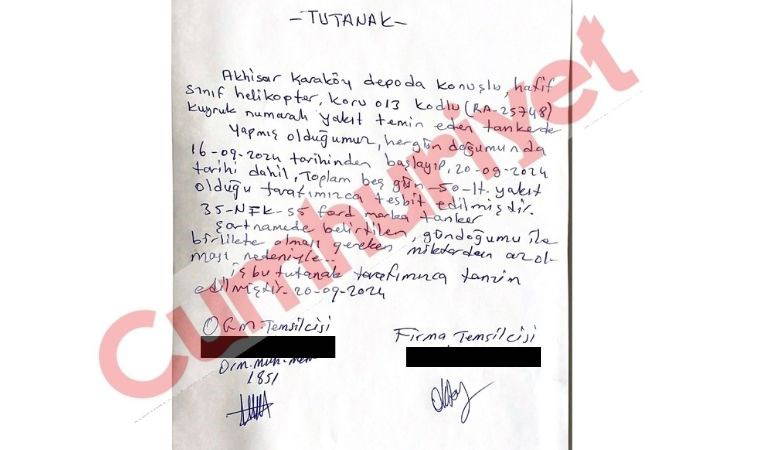 Anlaşmalar gereği her helikopterin yanında en az 10 ton yakıt olması gerekiyor ancak tutanaklara göre bu yükümlülük de yerine getirilmedi. 19 Eylül’de Antalya Kumluca Orman İşletme Şefliği’nde konuşlanan RA-24561 kuyruk numaralı helikopter için ayrılan 07 AYK 939 plakalı tankerde 4 gün boyunca yakıt olmadığı ve temin edilmediği tutanak altına alındı. 20 Eylül’de İzmir Bademler Orman Deposu’nda konuşlanan EX-08035 kuyruk numaralı helikopter için ayrılan 35 AJL 422 plakalı tankerde 5 günlük 700 litre yakıt olduğu tutanak altına alındı. Aynı şekilde Manisa Akhisar Karaköy Orman Deposu’nda konuşlanan RA-25748 kuyruk numaralı helikoptere yakıt temin eden 35 NFK 55 plakalı tankerde 16-20 Eylül arasında sadece 50 litre yakıt olduğu tespit edilerek tutanak tutuldu.