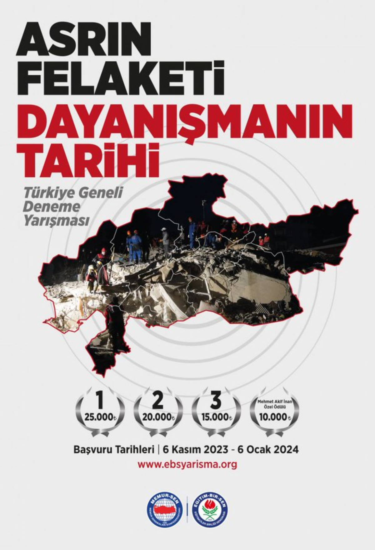 Hatay’da çekilen “Şahsi Meselem” filmine tepkiler dinmezken şimdi de “para ödüllü” deprem yarışması düzenleniyor. İnönü Üniversitesi Rektörü Ahmet Kızılay’ın da aralarında olduğu 29 kişilik seçici kurulun 18’inin unvanı “profesör doktor”, “doçent doktor”, “uzman doktor” ve 11’inin “yazar”. Memur-Sen ve Eğitim-Bir-Sen de birincinin 25 bin TL, ikincinin 20 bin TL, üçüncünün 15 bir TL ve Mehmet Akif İnan Özel Ödülü 10 bin TL olan “Asrın Felaketi Dayanışmanın Tarihi-Türkiye Geneli Deneme Yarışması” düzenliyor. Yarışmaların sosyal medyada ortaya çıkmasından sonra “Etik”, “Etik değil” tartışması başladı.