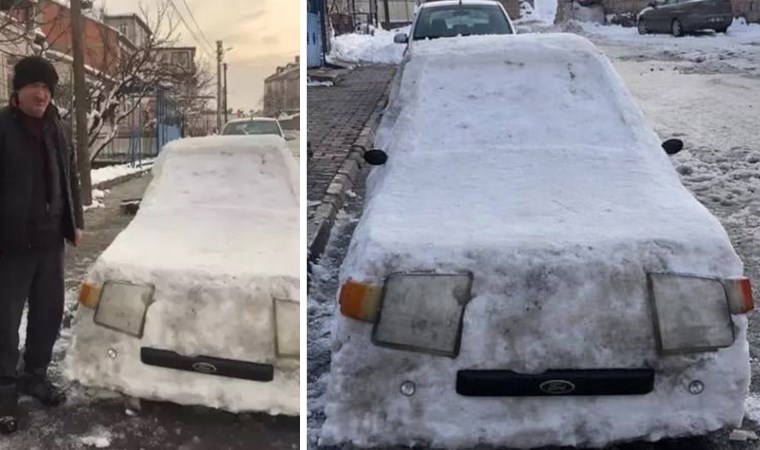 Yoğun karı fırsat bilen Abdurrahman Gezer ile oğlu Abdullah Gezer, Selçuklu Mahallesi Altınkılıç Sokak'taki evlerinin önüne, 4 günlük çaba sonucunda kardan otomobil yaptı.