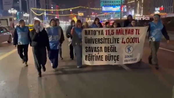 Öğrenciler "NATO'ya 11.5 Milyar TL, Üniversiteliye 4 bin TL. Savaşa Değil Eğitime Bütçe" pankartı ve "Yoksulluğa mahkum olmayacağız" sloganıyla yürüdü.