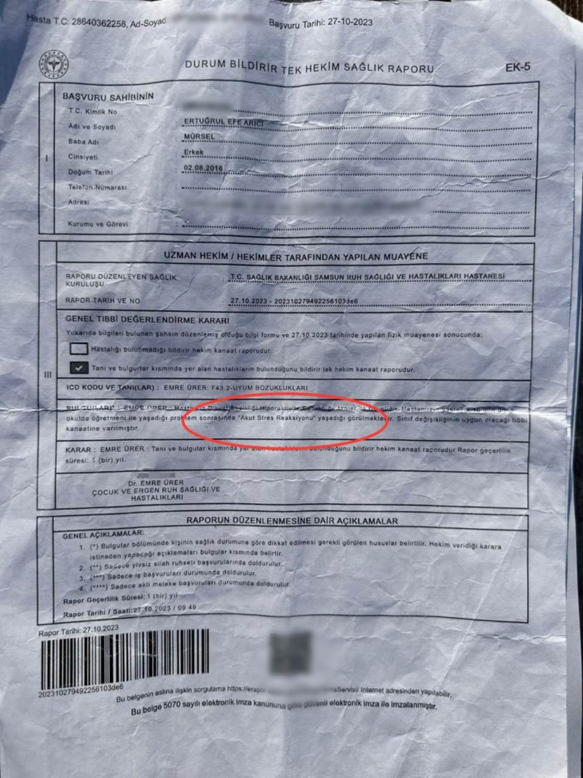 Çocuğunu Samsun Ruh Sağlığı ve Hastalıkları Hastanesine götürerek 'akut stres bozukluğu' raporu aldığını belirten Mürsel Arıcı, bu rapor sonrasında çocuğun sınıfının değiştirildiğini ifade etti.