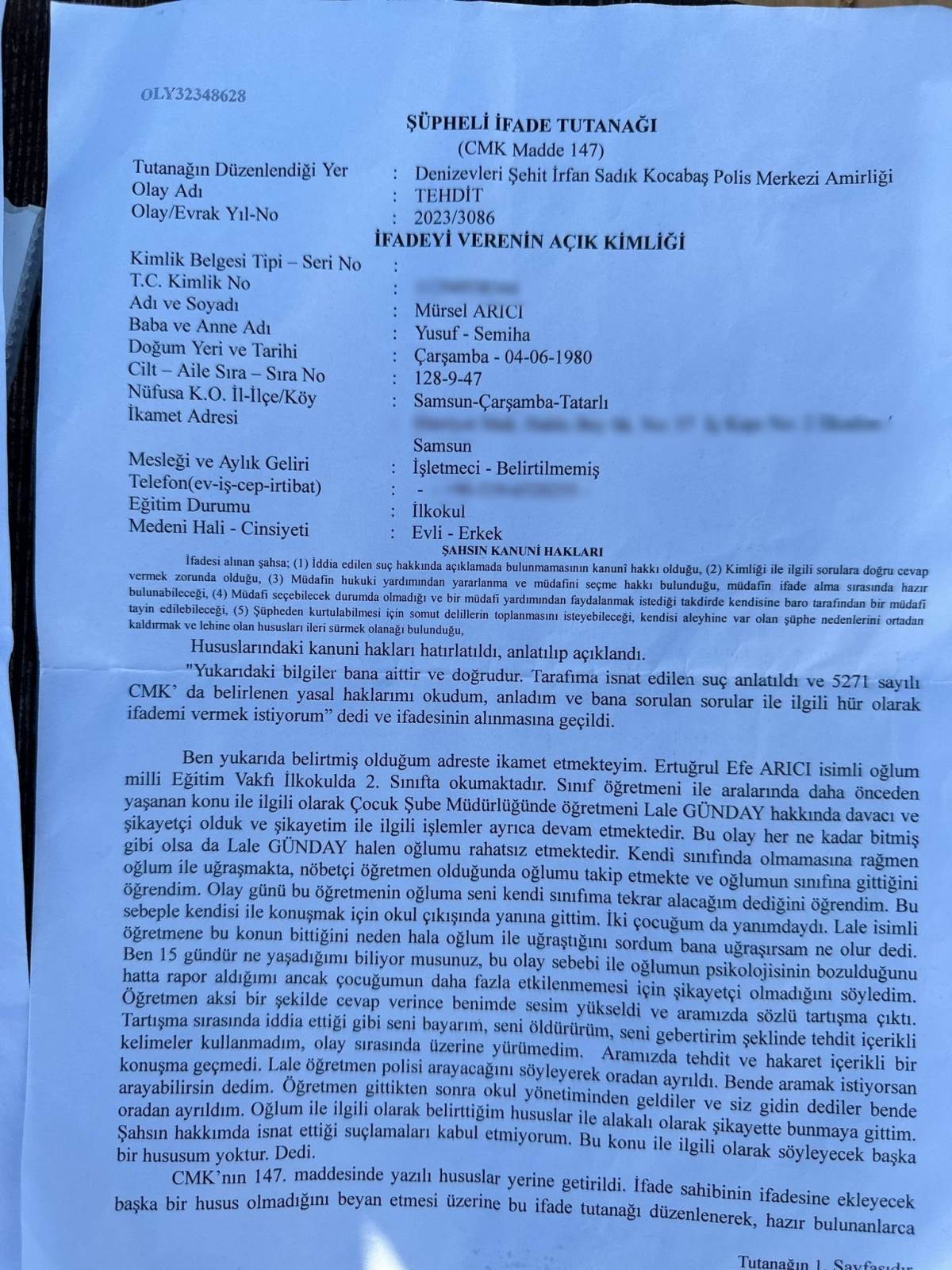 Öğretmenin açıklamalarının doğru olmadığını ifade eden veli Mürsel Arıcı, "Milli Eğitim Vakfı İlkokulu’nda 2 çocuğum okuyor. Öğretmen hanımın yapmış olduğu açıklamaya binaen bir açıklama yapma gereği doğmuştur. Olay 17 Ekim’de başlıyor. Çocuğun sırtından çantasını alarak sert bir şekilde atıyor. Diğer öğrencilerin eşime söylemesi üzerine eşim de öğretmene soruyor. ‘İyi ki yaptım, yine yaparım’ gibi ifadelerde bulunuyor. Daha sonra sınıfta çocukları toplayarak tehdit ifadeleri kullanıyor. Çocuğum ise o an korkudan altına kaçırıyor. Tırnaklarını yiyor. Psikolojik travma yaşıyor. Bu olaydan sonra Samsun Ruh Sağlığı ve Hastalıkları Hastanesinden ’akut stres bozukluğu’ raporu aldık. Daha sonra sınıf değişikliği yapıldı. Sınıf değişikliği olduktan sonra daha saldırgan bir hale geldi. ‘O çocuğu benim sınıfımdan alamazsınız, size neler yapacağım’ gibi tehditler savurdu. Olay adli makamlara intikal etti. Yaptığı açıklamalar doğru değil. Kendisini ölümle tehdit etmedim, fiziksel bir temasım olmadı. 20 günden beri başvurmadığım merci kalmadı. Şu anda olay yargı aşamasındadır. Kamera görüntüleri ortaya çıktığında gerçek de ortaya çıkacaktır" dedi.