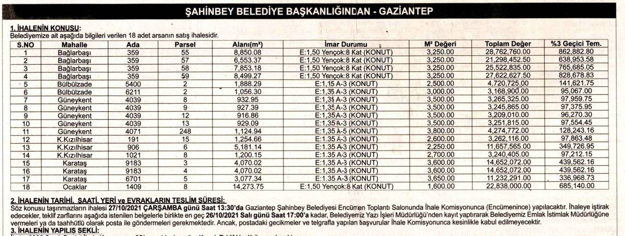 Başkanlığını AKP'li Mehmet Tahmazoğlu'nun yaptığı belediye, gazetelere verdiği ilanlar ile değeri 215 milyon TL olduğu belirtilen 28 adet kamu arazisi satışa çıkardı.