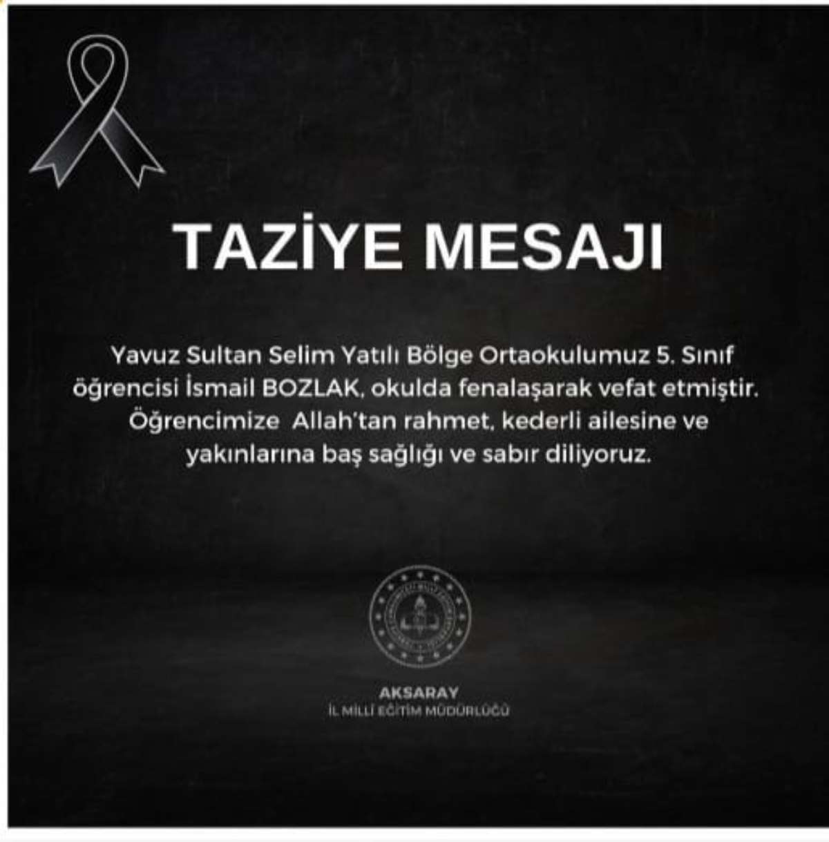 Aksaray İl Milli Eğitim Müdürlüğü de İsmail Bozlak için taziye mesajı yayınladı.