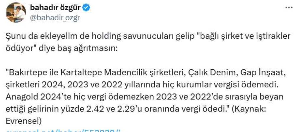 Gazeteci Bahadır Özgür'ün paylaştığı bilgilere göre Çalık Holding'in yıllara göre vergi karnesi şu şekilde: