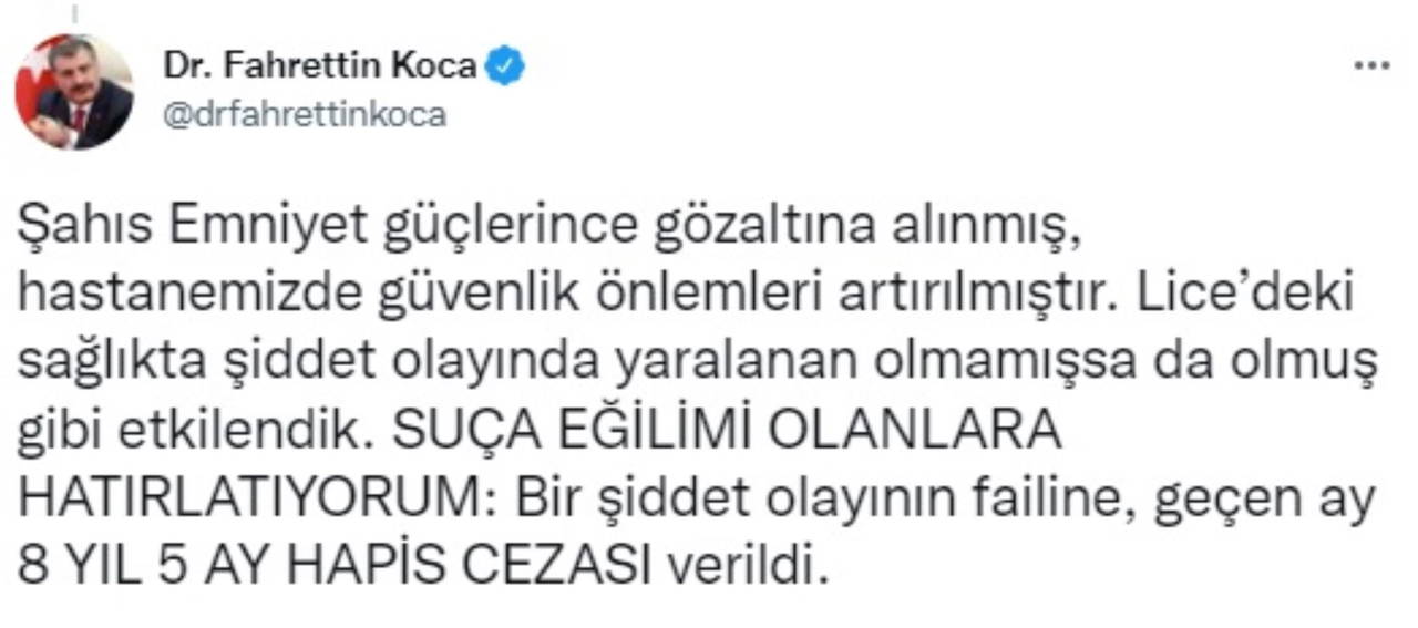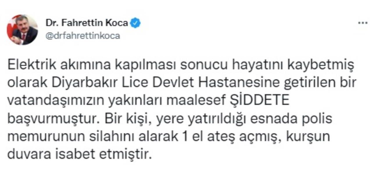 Sağlık Bakan Fahrettin Koca, ise konuyla ilgili Twitter hesabından yaptığı açıklamada şu ifadeleri kullandı: "Elektrik akımına kapılması sonucu hayatını kaybetmiş olarak Diyarbakır Lice Devlet Hastanesine getirilen bir vatandaşımızın yakınları maalesef şiddete başvurmuştur. Bir kişi, yere yatırıldığı esnada polis memurunun silahını alarak 1 el ateş açmış, kurşun duvara isabet etmiştir. Şahıs Emniyet güçlerince gözaltına alınmış, hastanemizde güvenlik önlemleri artırılmıştır. Lice'deki sağlıkta şiddet olayında yaralanan olmamışsa da olmuş gibi etkilendik. Suça eğilimli olanlara hatırlatıyorum: Bir şiddet olayının failine, geçen ay 8 yıl 5 ay hapis cezası verildi"