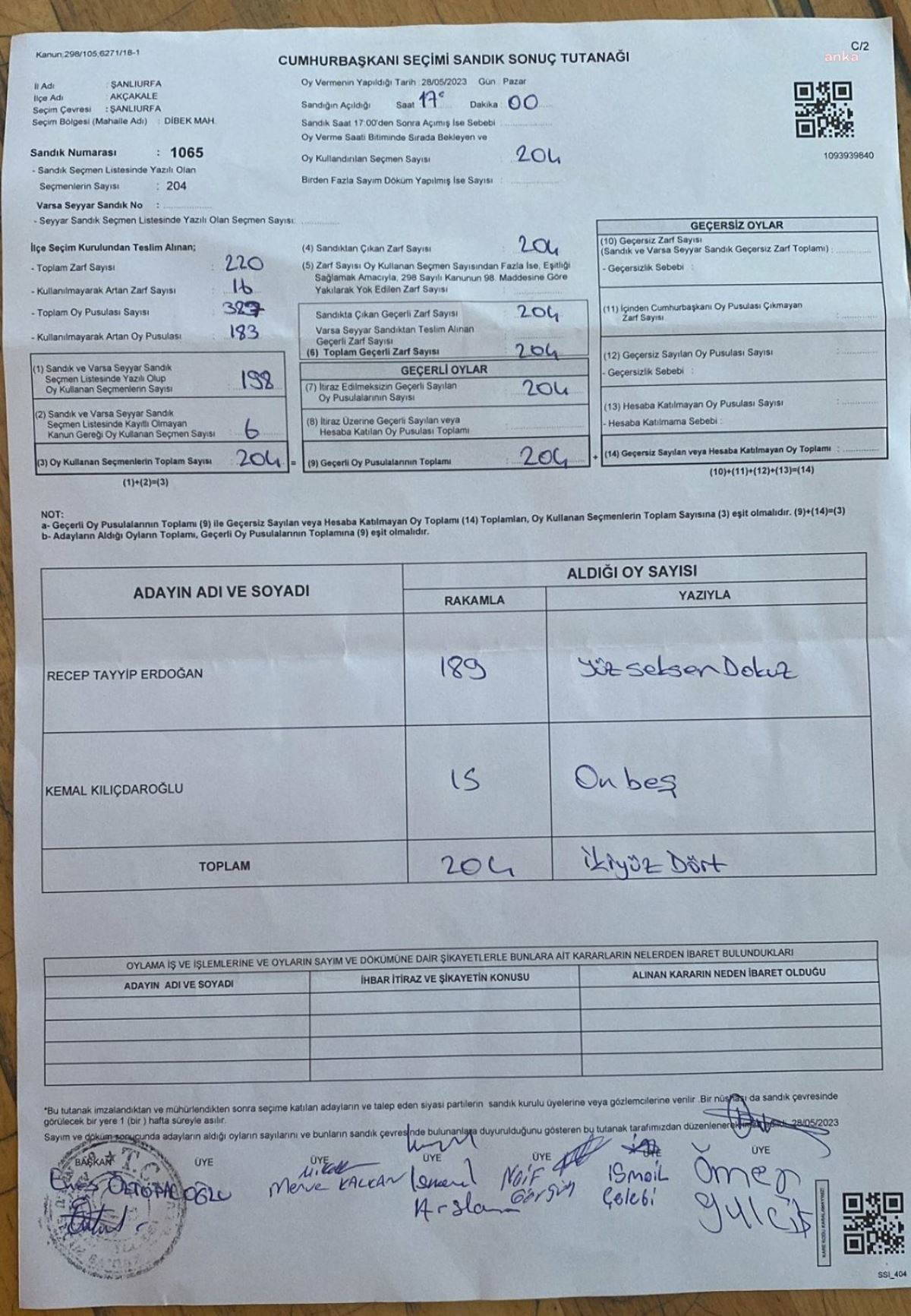 Gergerlioğlu'nun paylaşımına eklediği Saat 17.00'den önce imzalandığı ifade edilen tutanakta, 204 seçmeni olan 1065 numaralı sandıkta yüzde 100 katılımla 204 geçerli oy kullanıldığı; Cumhur İttifakı cumhurbaşkanı adayı Recep Tayyip Erdoğan'a 189 oy, Millet İttifakı cumhurbaşkanı adayı Kemal Kılıçdaroğlu'na ise 15 oy verildiği görülüyor.
