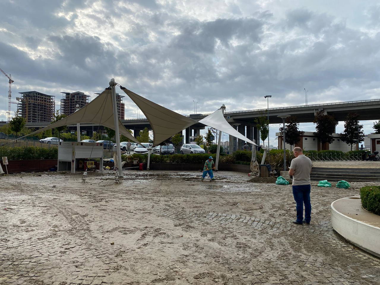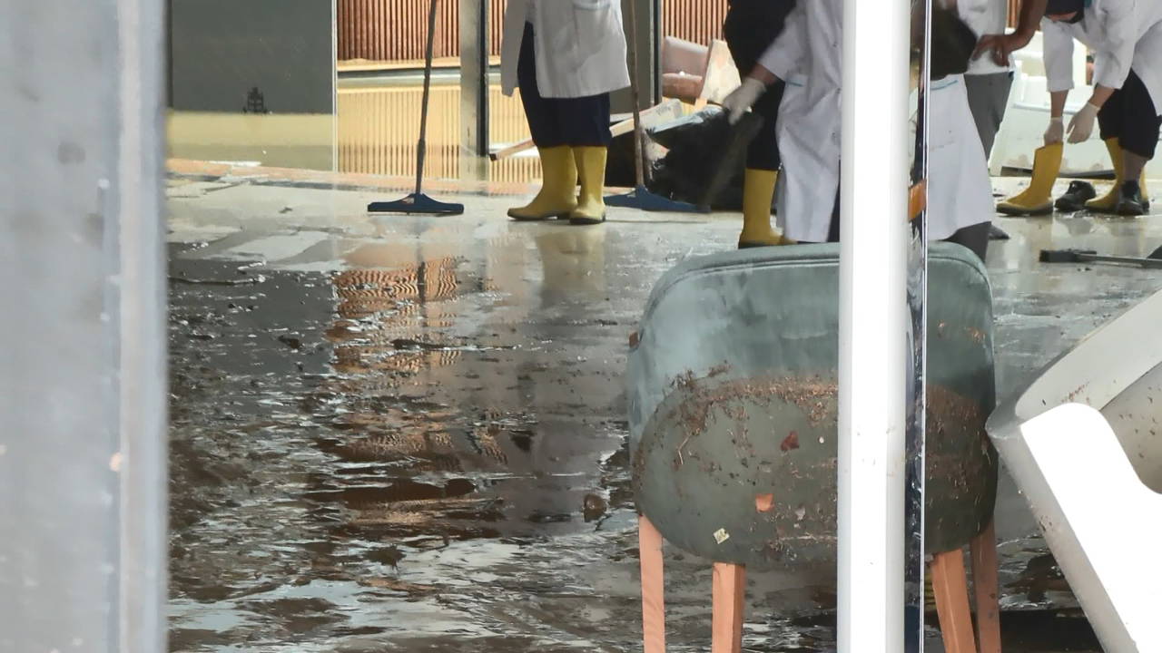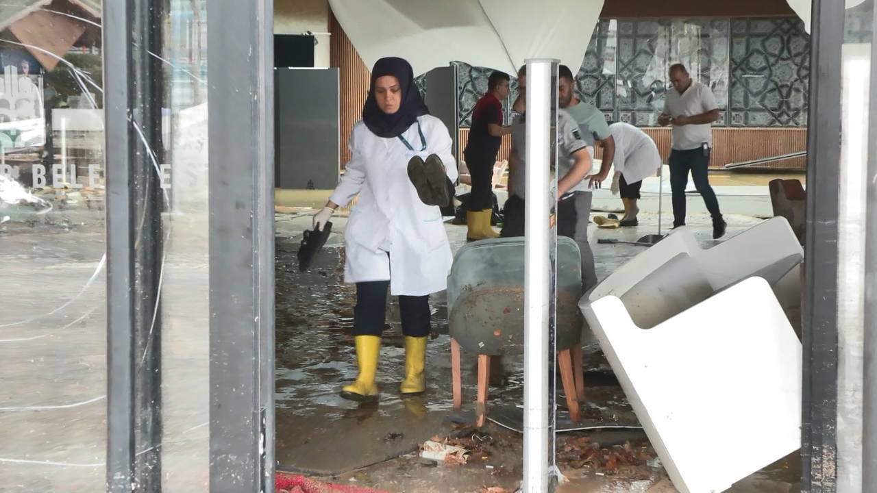 Sitedeki iş yerlerinin çalışanları bodrumdaki suların tahliye edilmesini beklerken kıraathanede ise temizlik çalışmaları başladı.