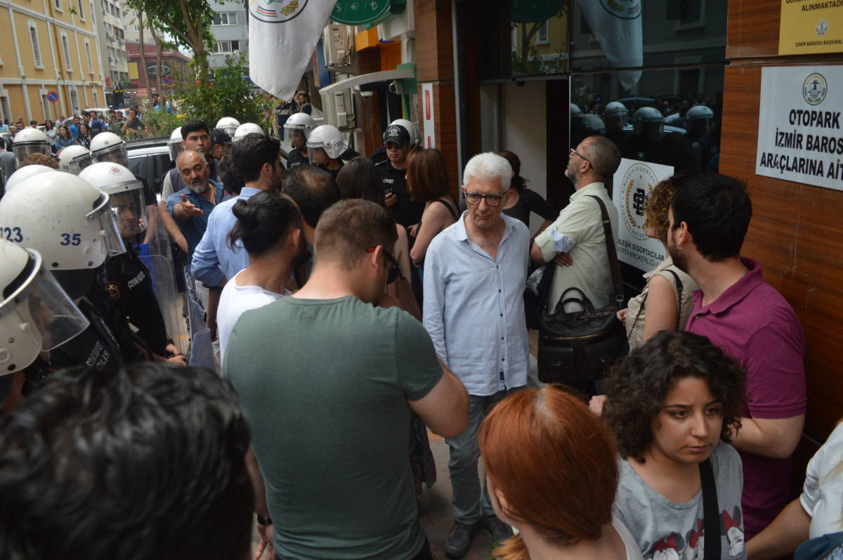Polis müdahalesinin ardından İzmir Barosu’ndan yapılan açıklamada “saldırıyı lanetleyerek” suç duyurusunda bulunacaklarını bildirdi.