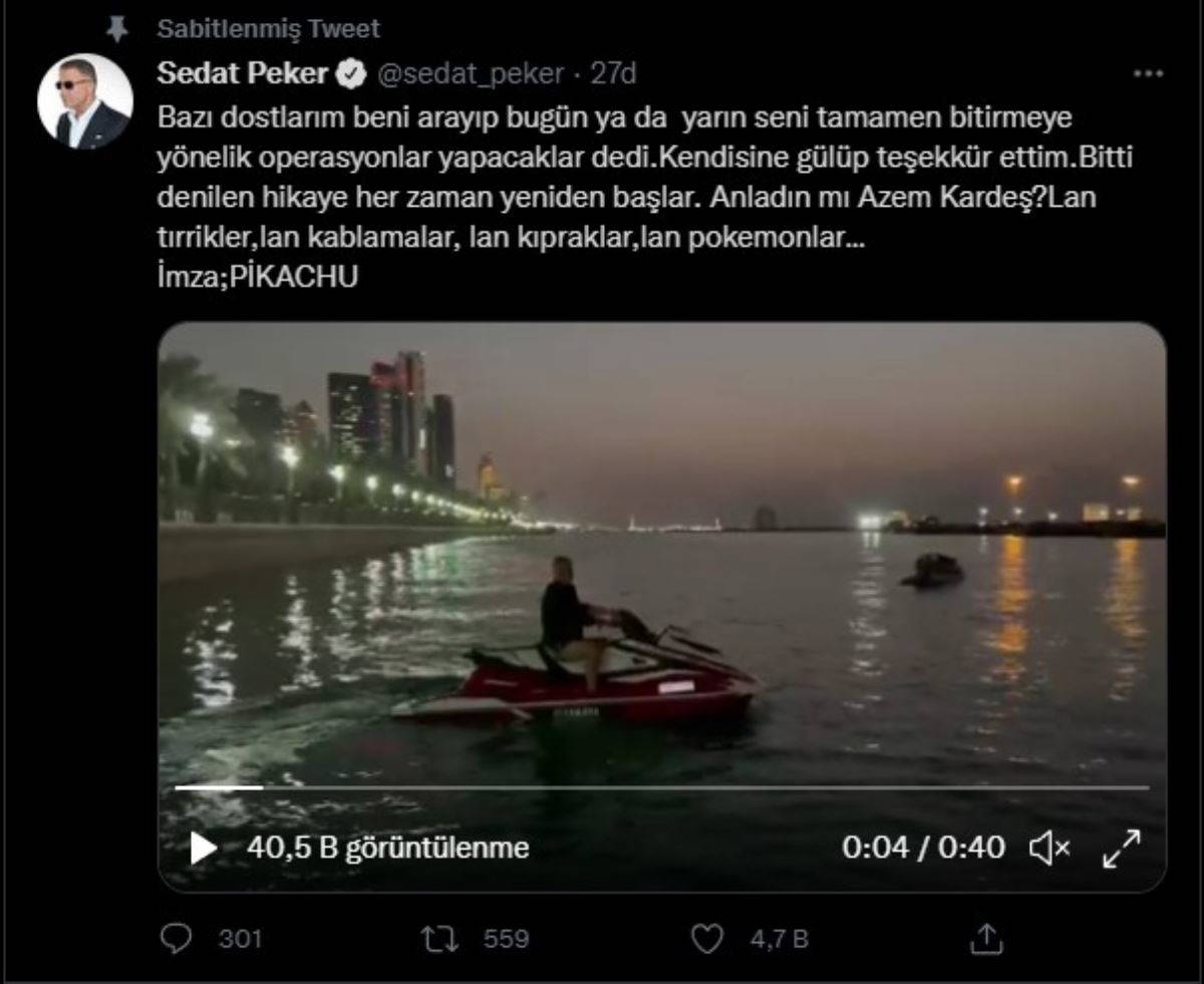 "Bazı dostlarım beni arayıp bugün ya da yarın seni tamamen bitirmeye yönelik operasyonlar yapacaklar dedi. Kendisine gülüp teşekkür ettim. Bitti denilen hikaye her zaman yeniden başlar. Anladın mı Azem Kardeş? Lan tırrikler, lan kablamalar, lan kıpraklar, lan pokemonlar… İmza; PİKACHU"(Sedat Peker'in açıklaması, olduğu gibi aktarılmıştır. İmla hataları ve anlam bozuklukları kendisine aittir)