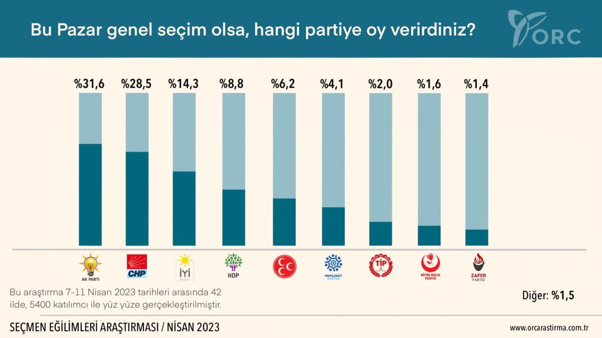 ORC Araştırma, 7-11 Nisan tarihleri arasında, 42 ilde 5 bin 400 katılımcı ile gerçekleştirdiği seçim anketinin sonuçlarını paylaştı. Katılımcılara, "Bu pazar seçim olsa hangi adaya oy verirsiniz?" sorusu yöneltildi.