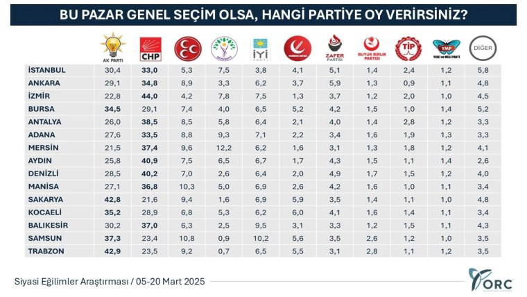 Belediye başkanı gözaltına alınıp tutuklanan ve görevden alınan İstanbul'da 'CHP' diyenlerin oranı yüzde 33, AKP dyenlerin ise yüzde 30.4 oldu. İstanbul'da üçüncü sırada ise yüzde 7.5 ile DEM Parti yer aldı.